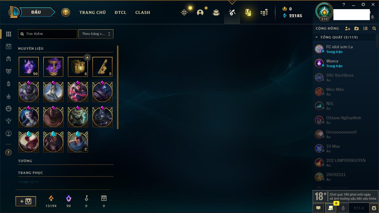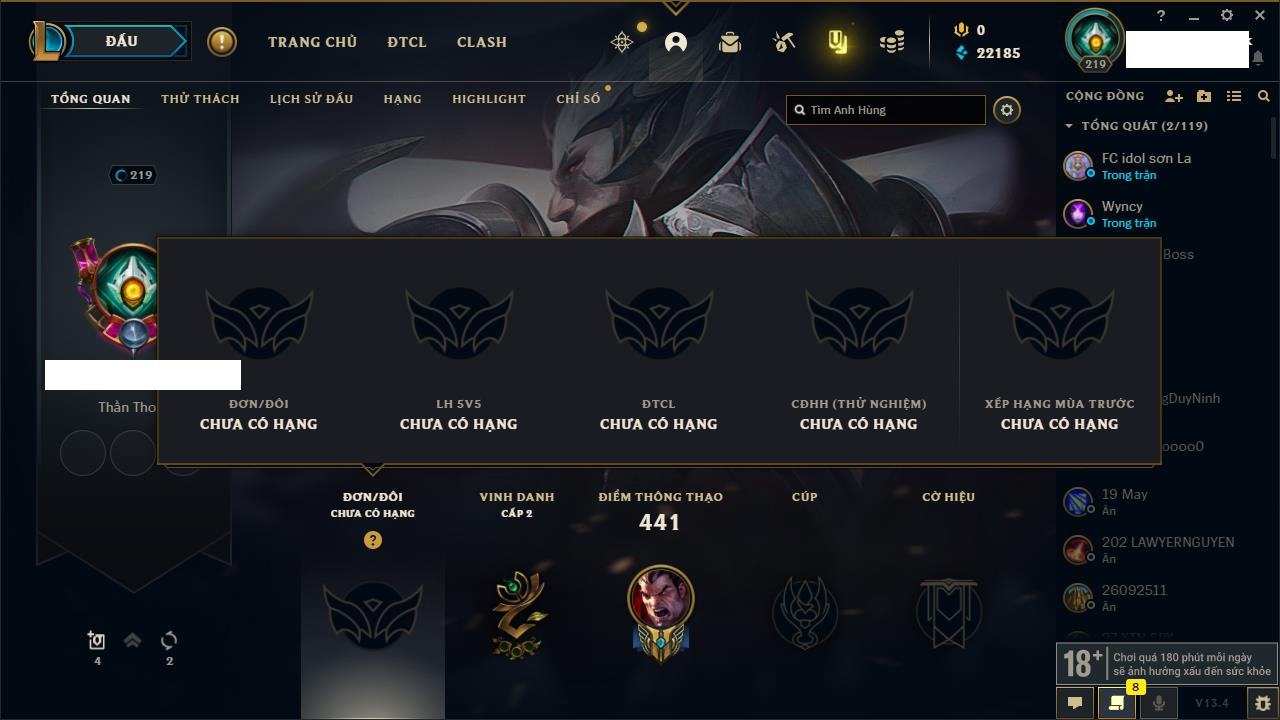 Rank Đơn: Lục Bảo IVKhung: VàngTướng: 171 - Còn 154648 THXTrang Phục: 203Rank ĐTCL: Bạch Kim IVLinh Thú: 69
