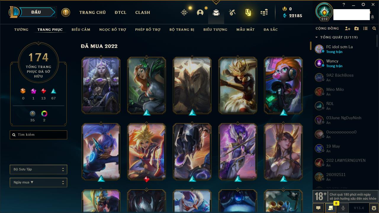 Rank Đơn: Vàng IIIKhung: VàngTướng: 172 - Còn 164704 THXTrang Phục: 255Rank ĐTCL: Kim Cương IVLinh Thú: 156