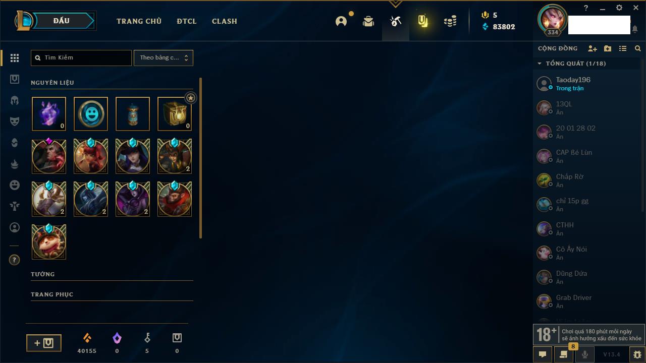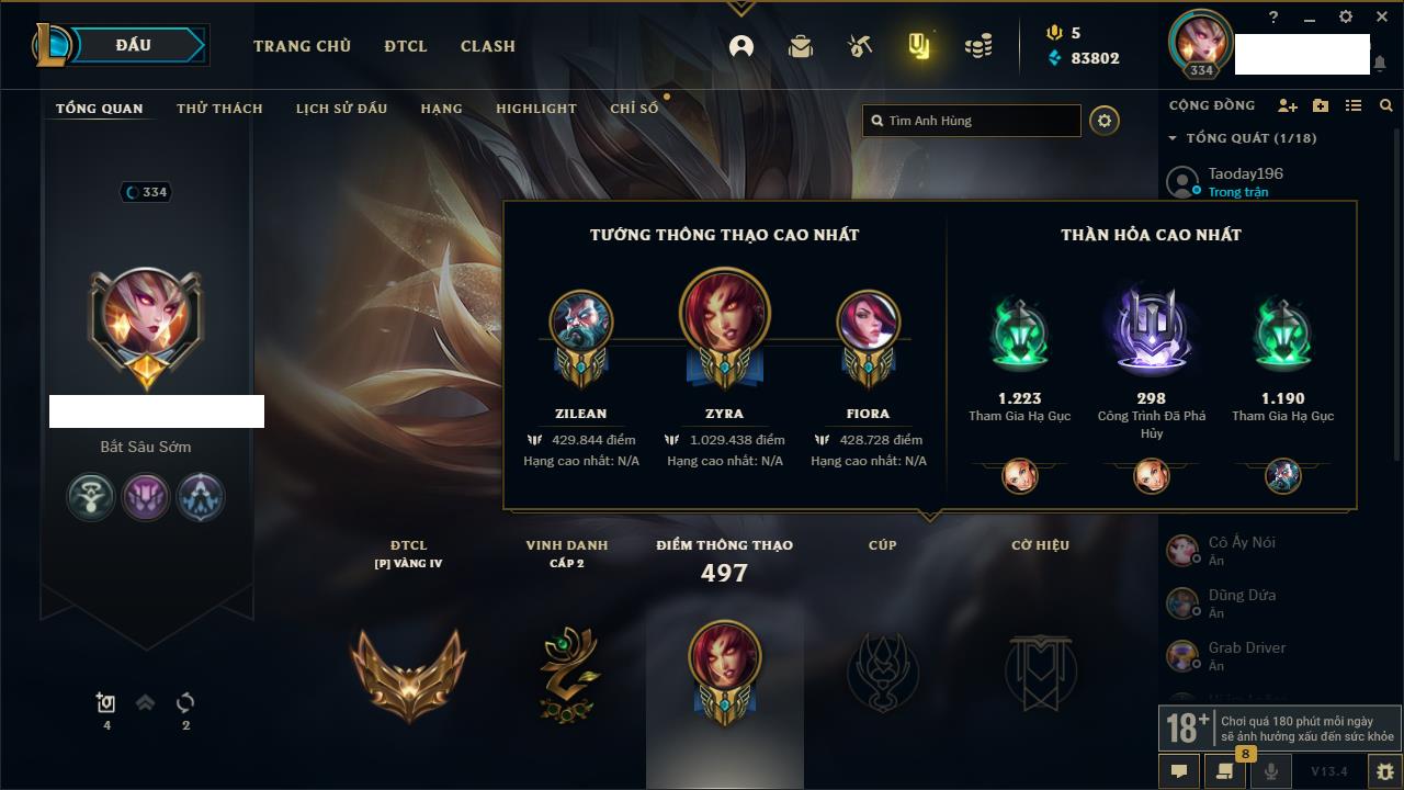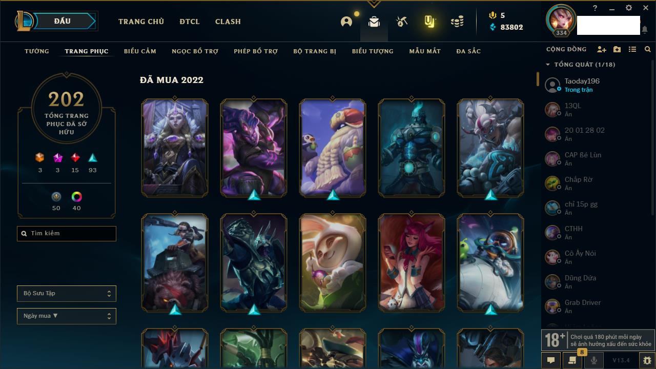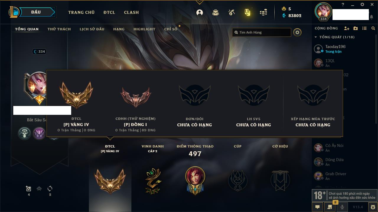 Rank Đơn: Bạch Kim IIKhung: Bạch kimTướng: 171 - Còn 316137 THXTrang Phục: 89Rank ĐTCL: Bạch Kim IIILinh Thú: 94