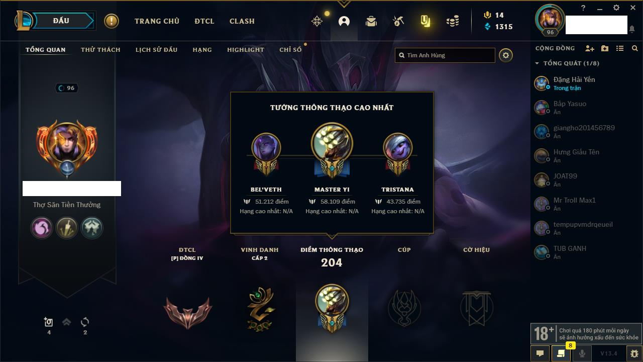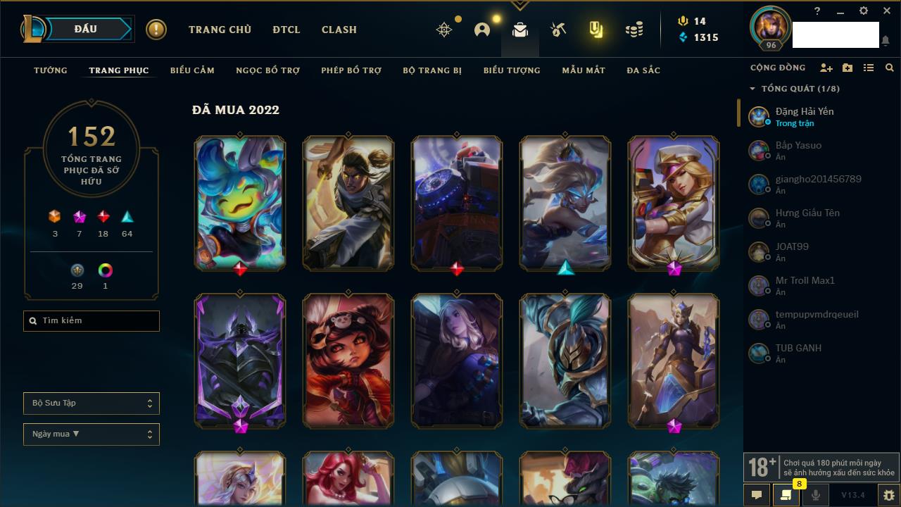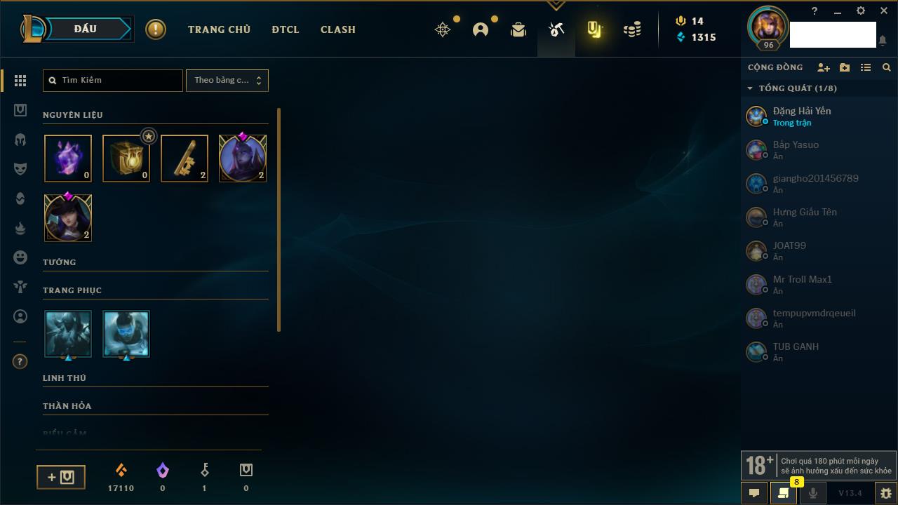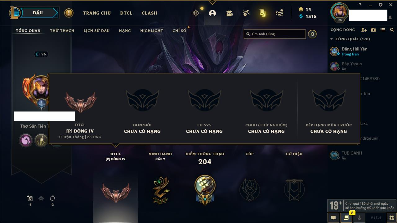 Rank Đơn: Vàng IIIKhung: BạcTướng: 171 - Còn 101359 THXTrang Phục: 88Rank ĐTCL: Kim Cương IVLinh Thú: 200