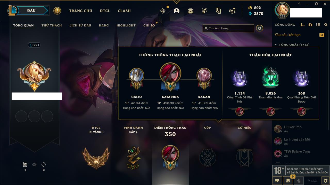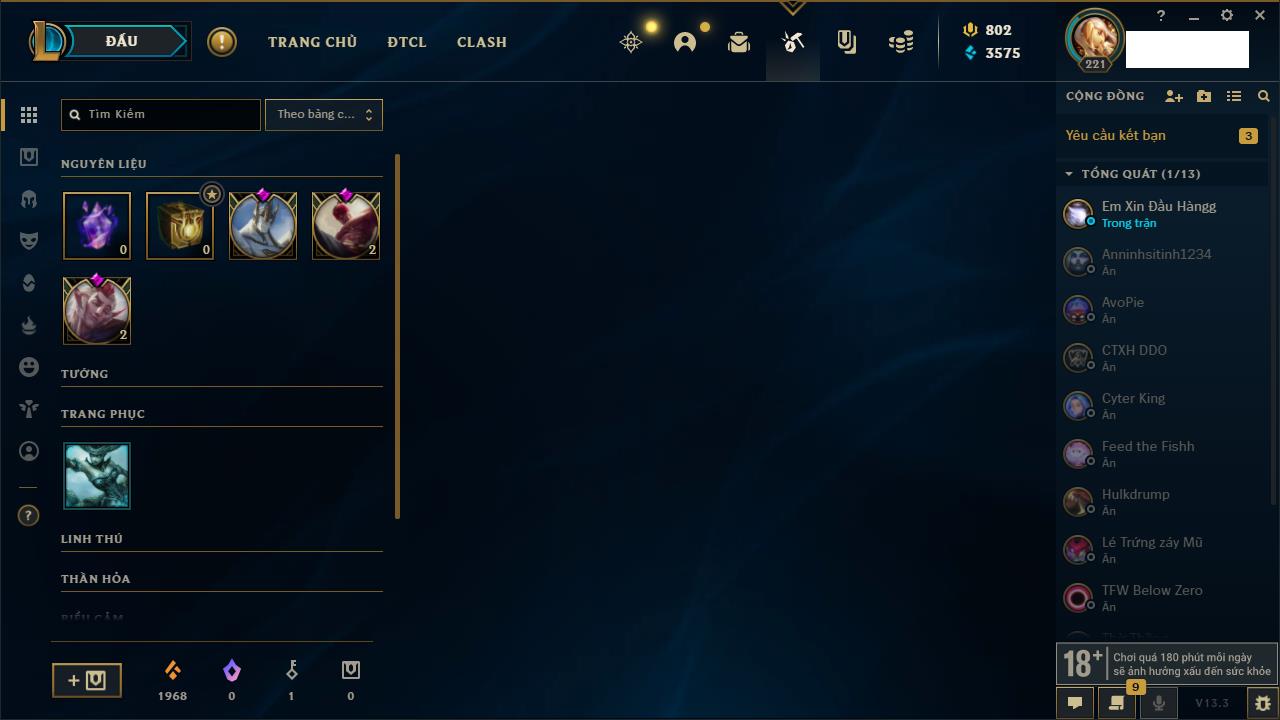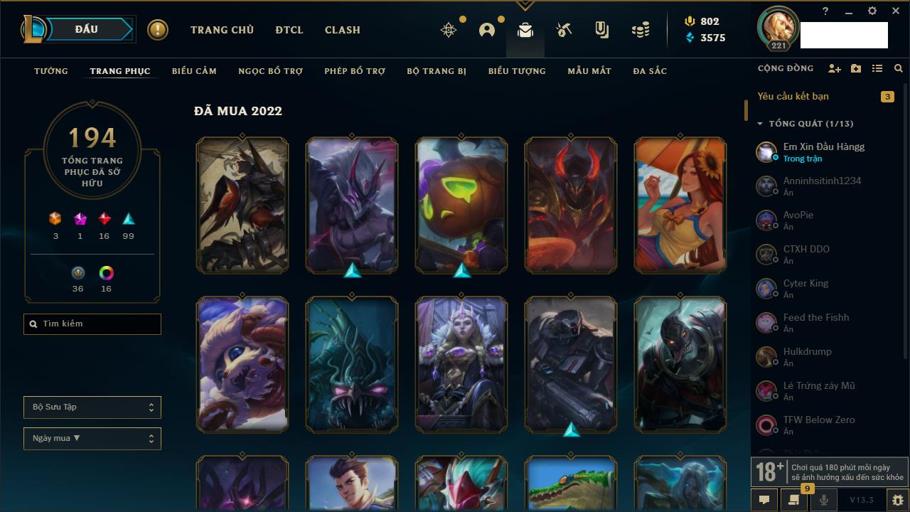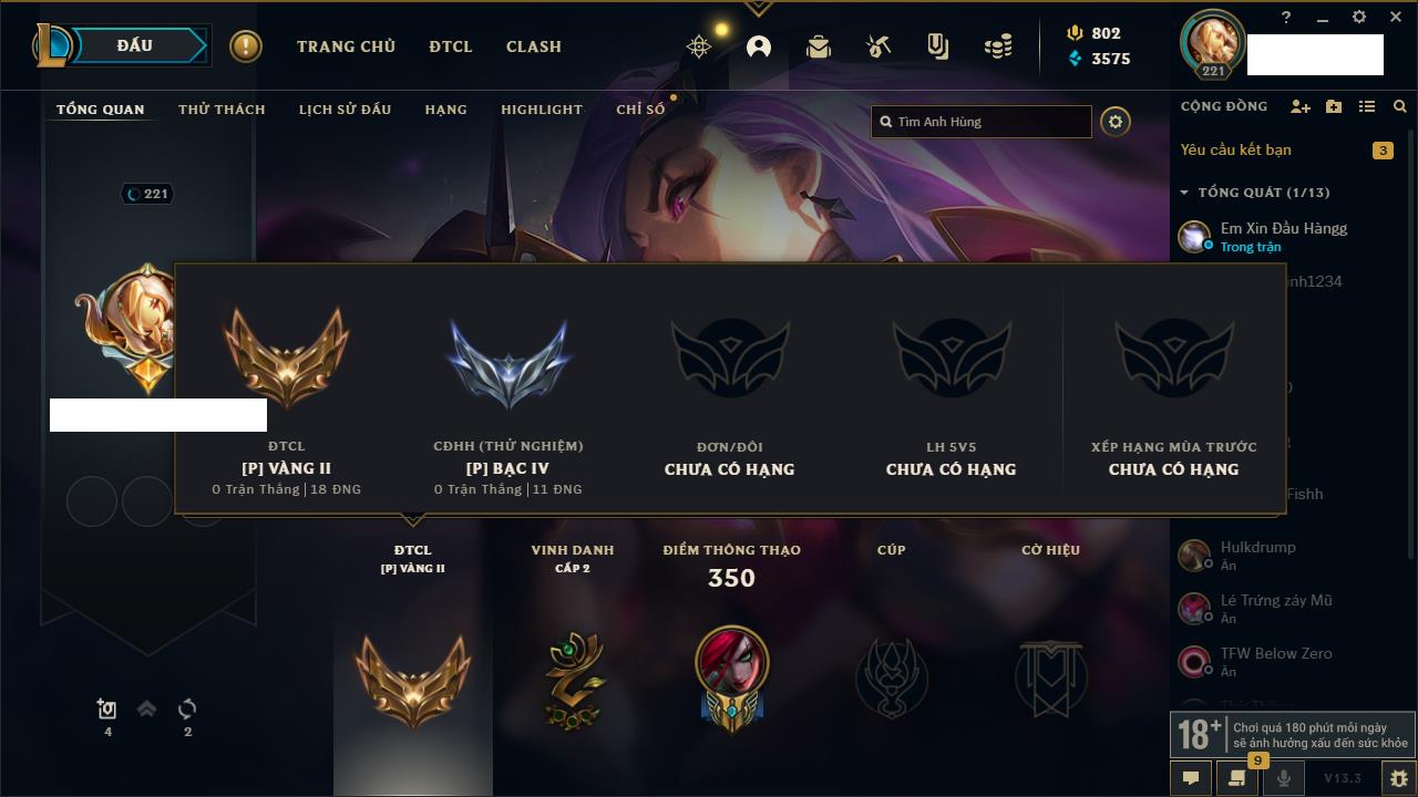 Rank Đơn: Bạc IIIKhung: VàngTướng: 171 - Còn 386278 THXTrang Phục: 170Rank ĐTCL: Chưa RankLinh Thú: 30