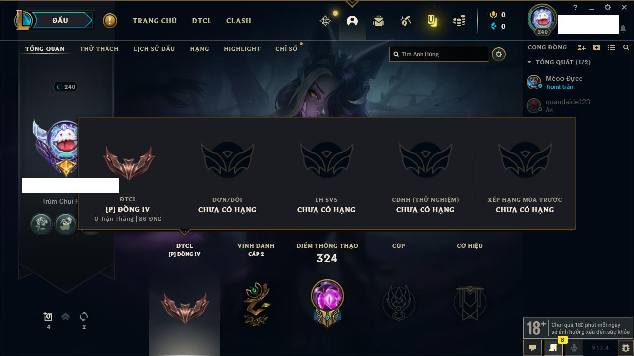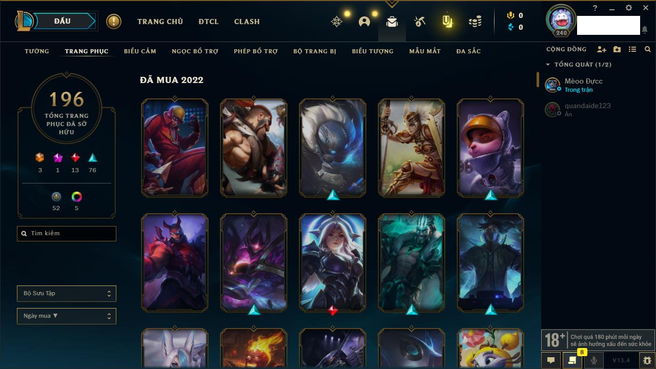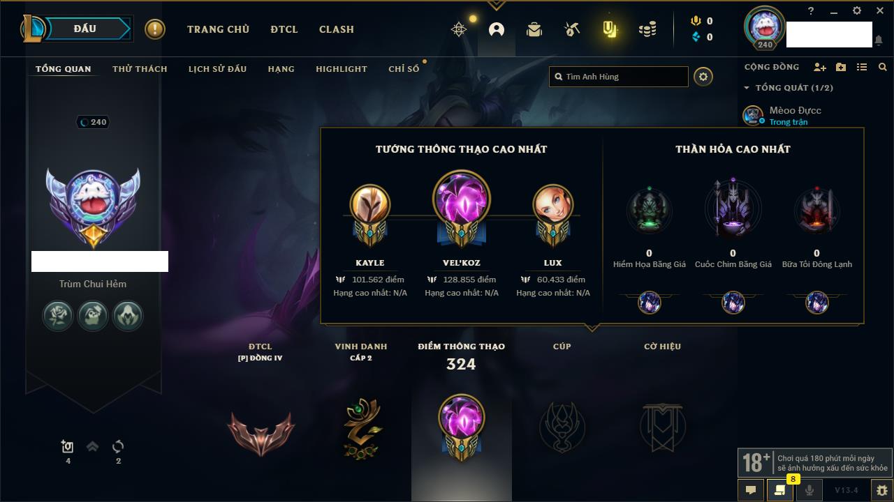 Rank Đơn: Bạc IIIKhung: BạcTướng: 168 - Còn 101710 THXTrang Phục: 184Rank ĐTCL: Chưa RankLinh Thú: 17