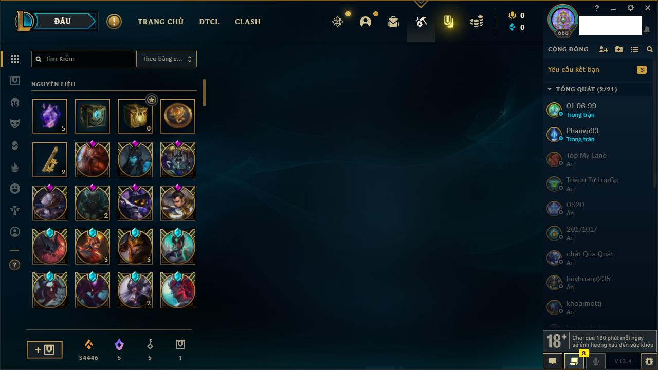 Rank Đơn: Vàng IIIKhung: Bạch kimTướng: 171 - Còn 98230 THXTrang Phục: 235Rank ĐTCL: Vàng IVLinh Thú: 59