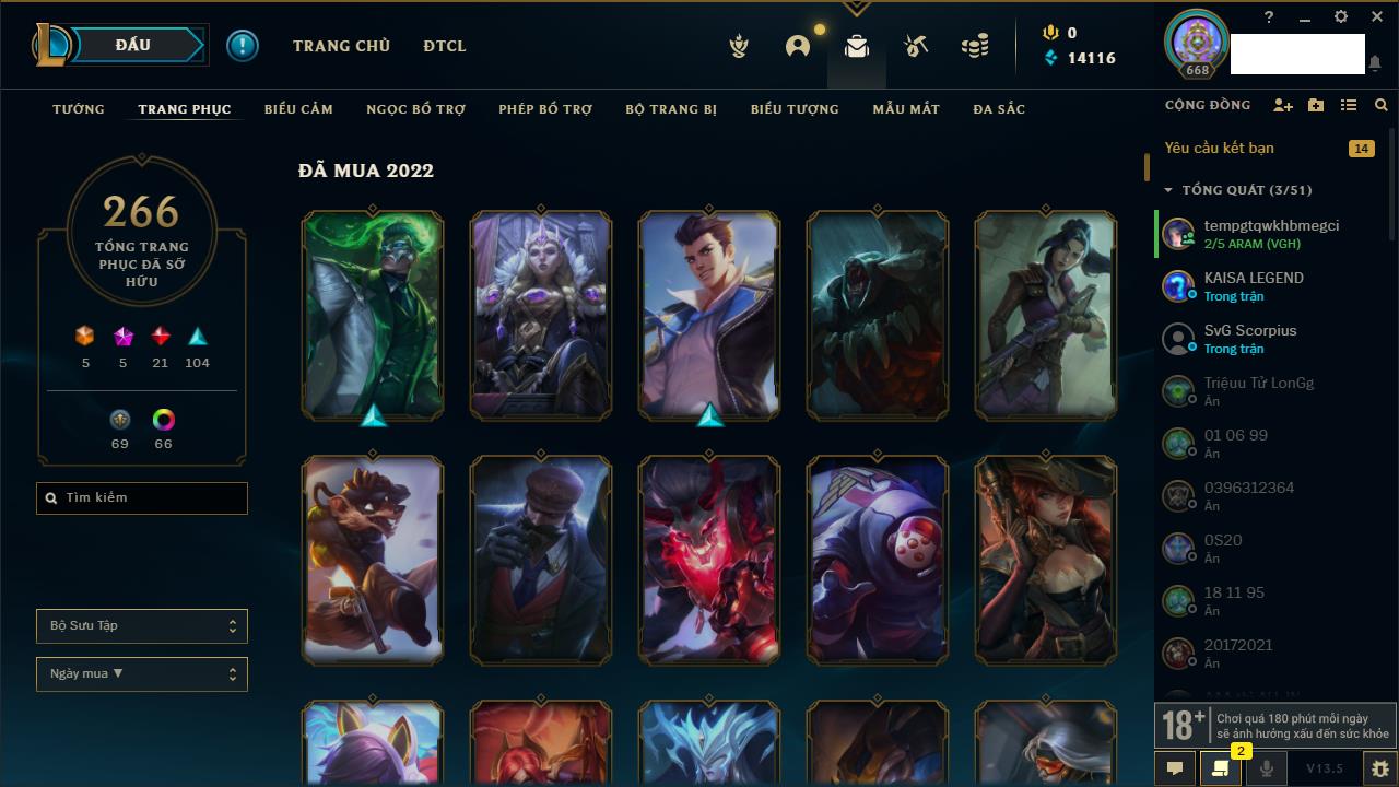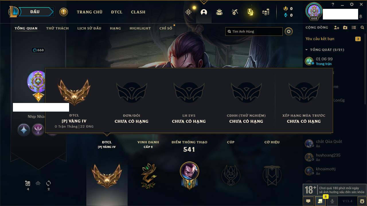 Rank Đơn: Vàng IIKhung: VàngTướng: 171 - Còn 219803 THXTrang Phục: 254Rank ĐTCL: Chưa RankLinh Thú: 78