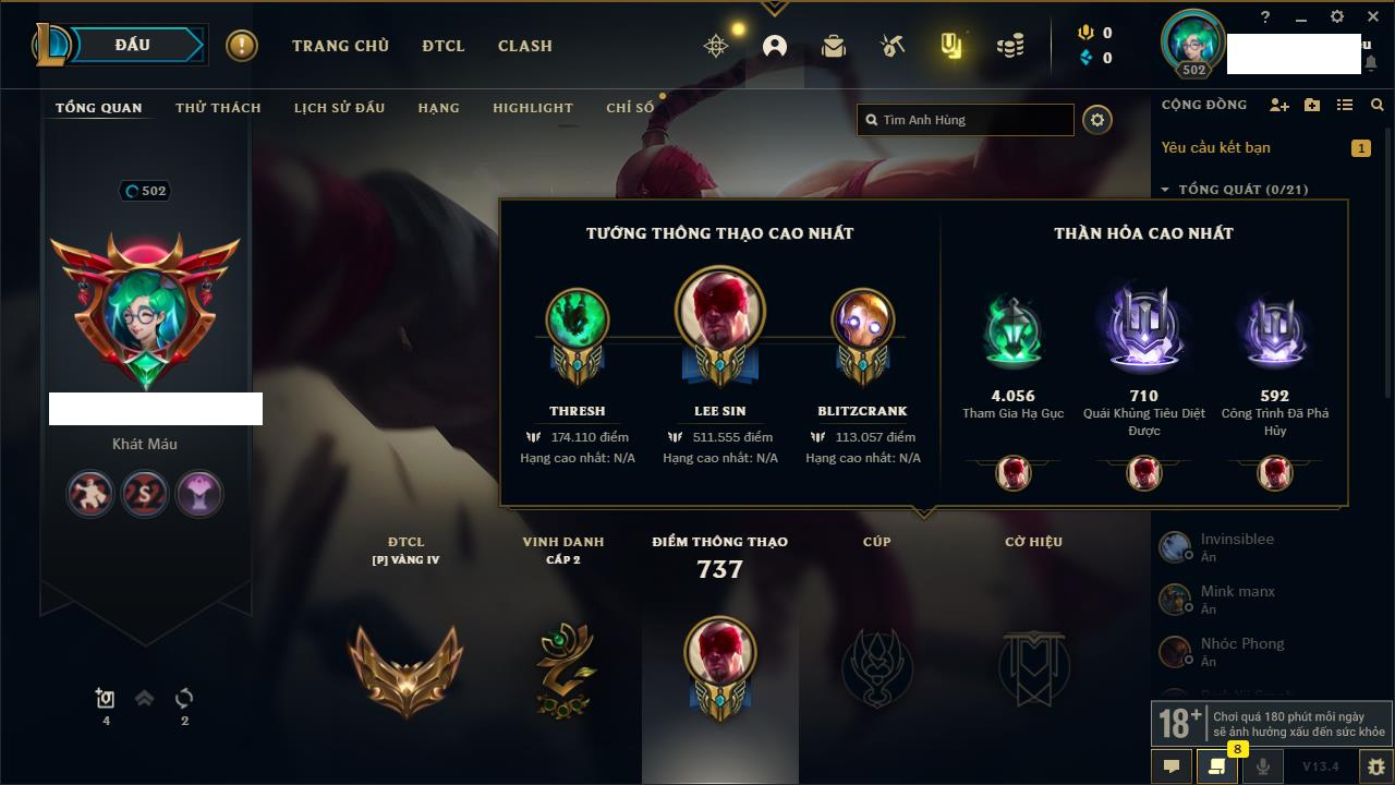 Rank Đơn: Bạch Kim IVKhung: VàngTướng: 171 - Còn 130578 THXTrang Phục: 253Rank ĐTCL: Chưa RankLinh Thú: 20