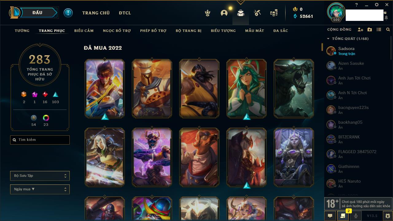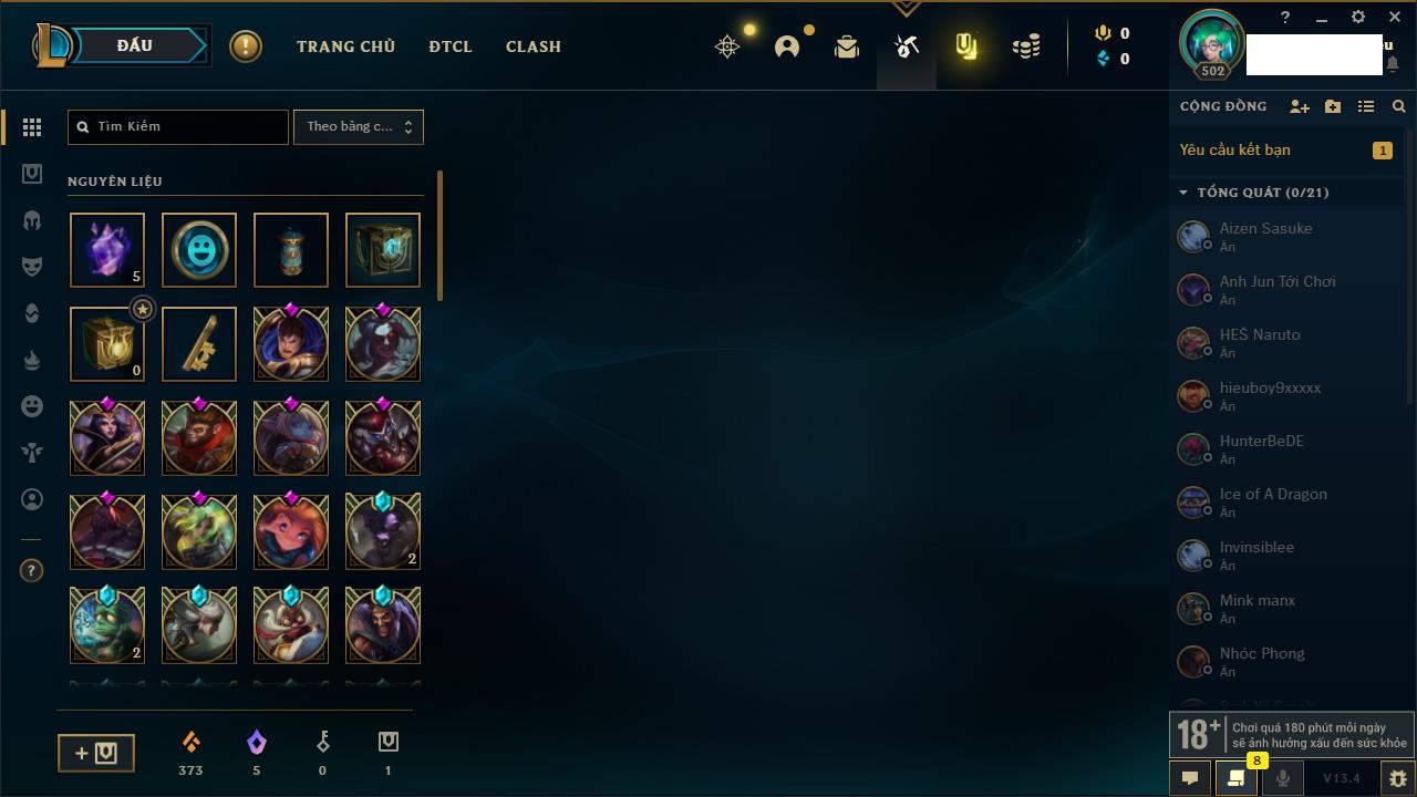 Rank Đơn: Vàng IIKhung: VàngTướng: 171 - Còn 219803 THXTrang Phục: 254Rank ĐTCL: Chưa RankLinh Thú: 78