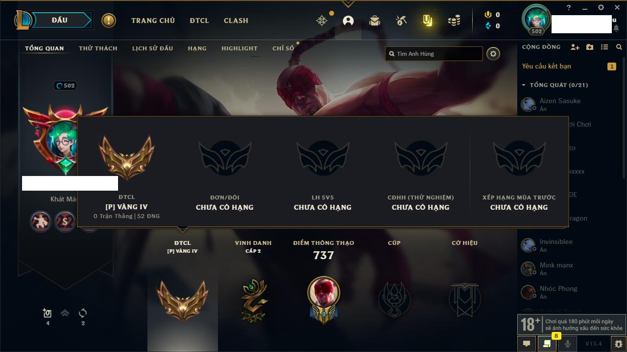 Rank Đơn: Bạc IVKhung: BạcTướng: 171 - Còn 173918 THXTrang Phục: 233Rank ĐTCL: Lục Bảo IIILinh Thú: 26