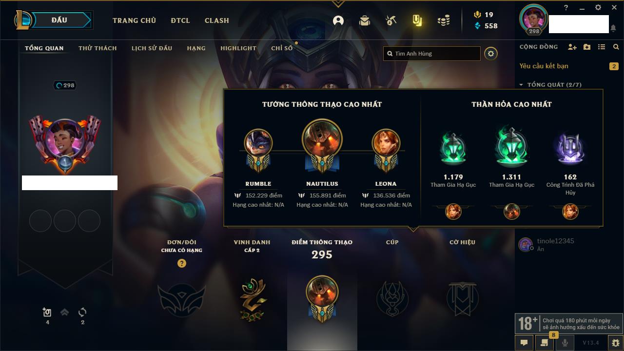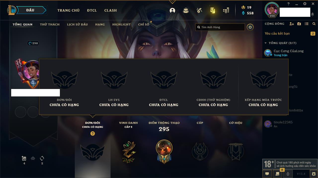 Rank Đơn: Chưa RankKhung: BạcTướng: 141 - Còn 299 THXTrang Phục: 101Rank ĐTCL: Chưa RankLinh Thú: 84