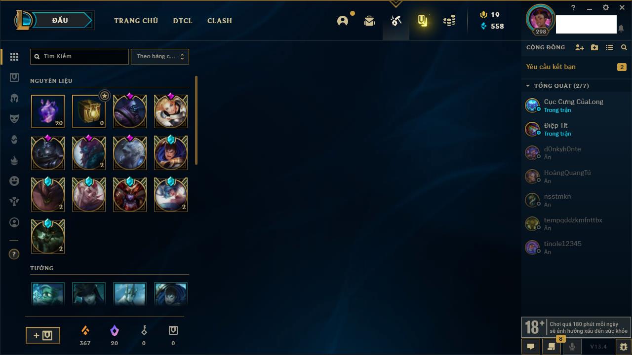 Rank Đơn: Chưa rank mùa nàoKhung: Chưa có khungTướng: 0 - Còn 2000 THXTrang Phục: 0Rank ĐTCL: Chưa RankLinh Thú: 14