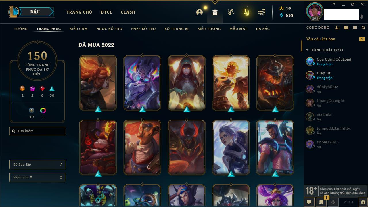 Rank Đơn: Chưa RankKhung: Chưa có khungTướng: 162 - Còn 23234 THXTrang Phục: 150Rank ĐTCL: Chưa RankLinh Thú: 42