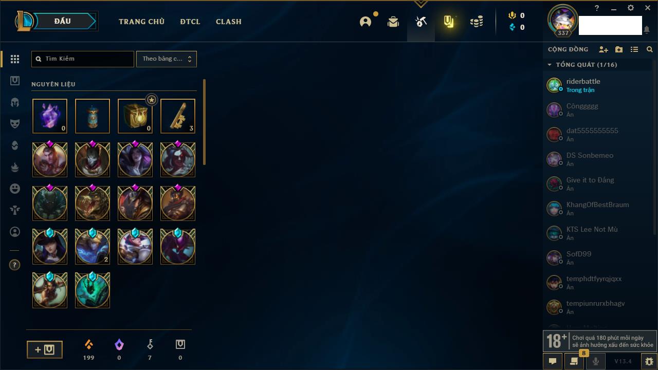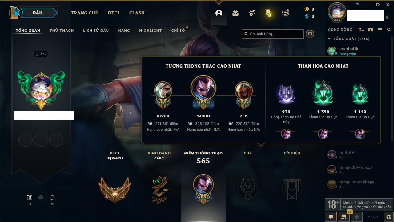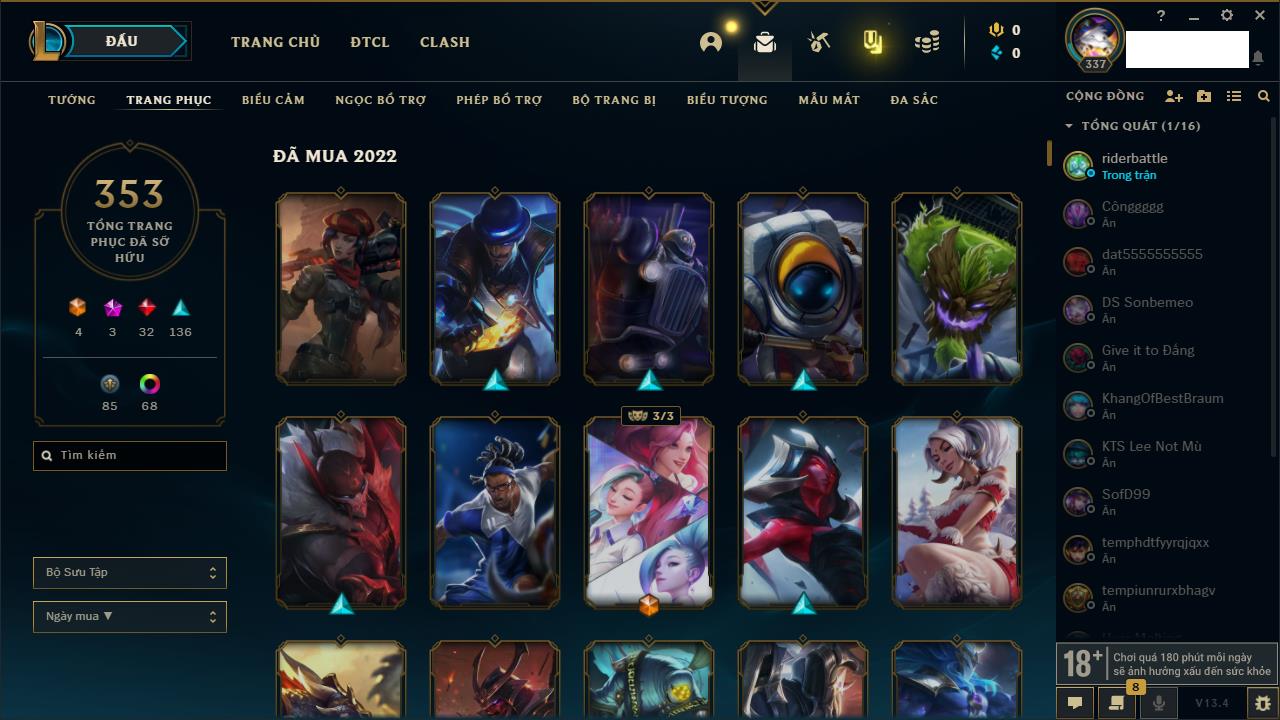 Rank Đơn: Vàng IKhung: Bạch kimTướng: 170 - Còn 212450 THXTrang Phục: 214Rank ĐTCL: Bạch Kim IVLinh Thú: 221