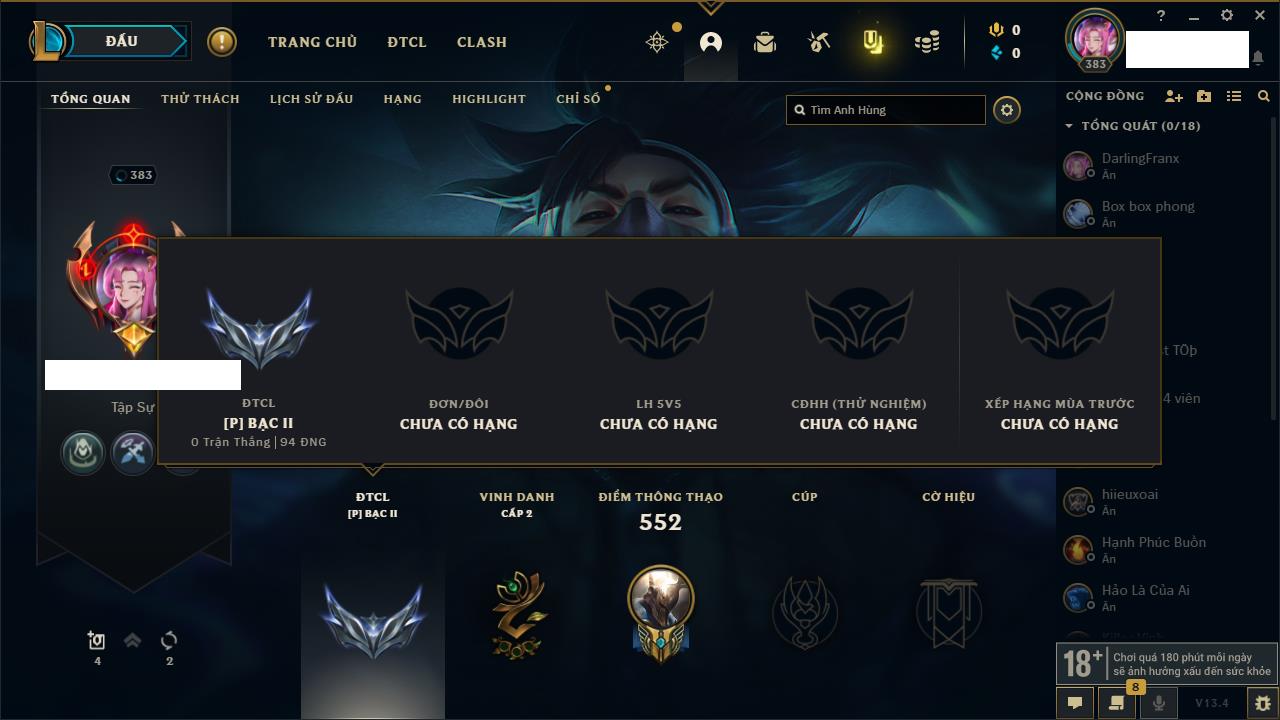 Rank Đơn: Vàng IIKhung: Bạch kimTướng: 172 - Còn 123420 THXTrang Phục: 231Rank ĐTCL: Bạch Kim IVLinh Thú: 213