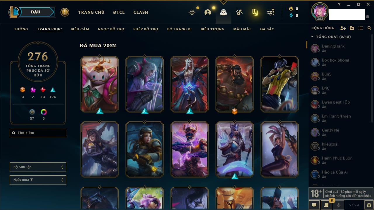 Rank Đơn: Vàng IIIKhung: VàngTướng: 172 - Còn 200315 THXTrang Phục: 87Rank ĐTCL: Chưa RankLinh Thú: 136