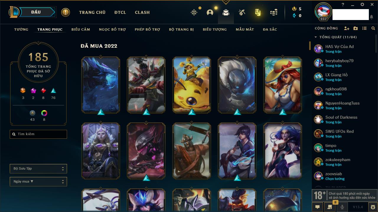 Rank Đơn: Chưa RankKhung: Chưa có khungTướng: 170 - Còn 13795 THXTrang Phục: 75Rank ĐTCL: Chưa RankLinh Thú: 176