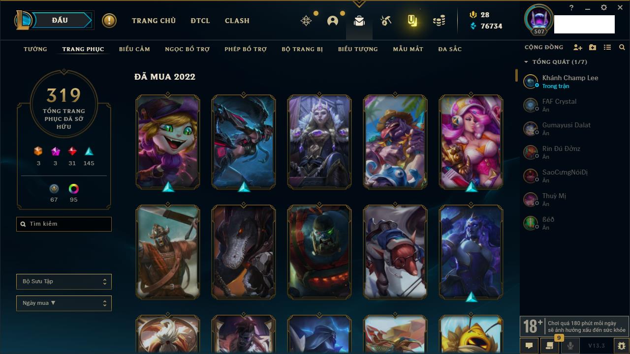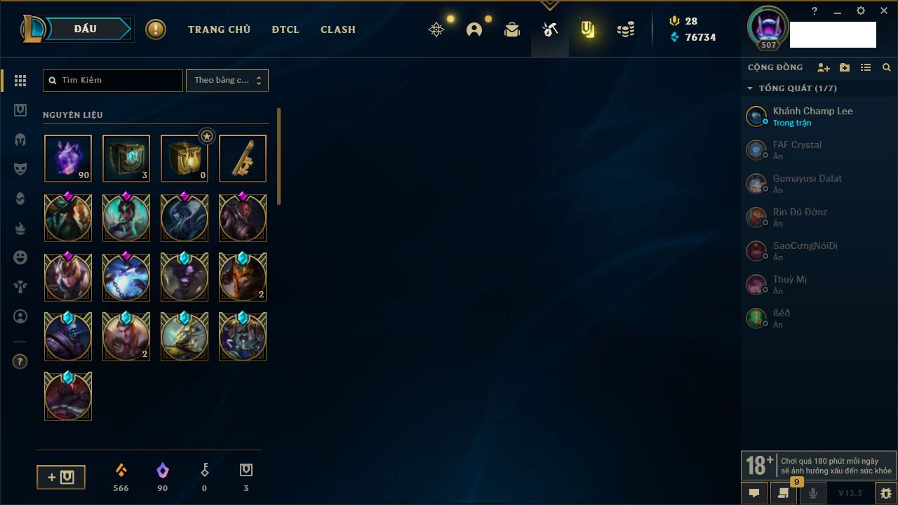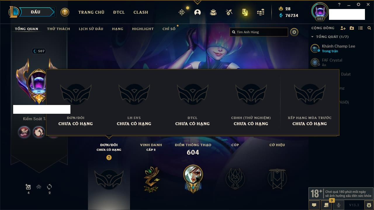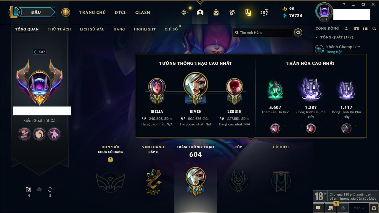 Rank Đơn: Bạc IIKhung: Bạch kimTướng: 169 - Còn 81813 THXTrang Phục: 301Rank ĐTCL: Chưa RankLinh Thú: 140