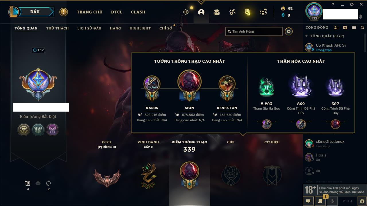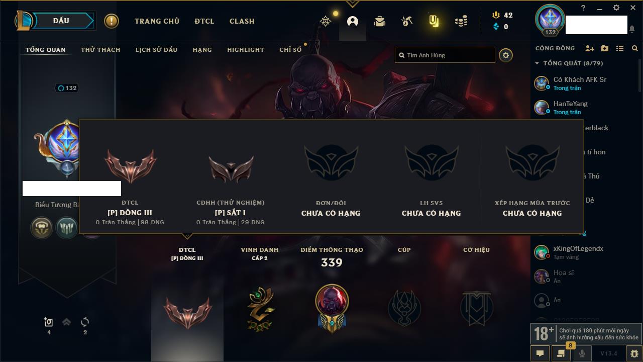 Rank Đơn: Vàng IKhung: BạcTướng: 171 - Còn 60584 THXTrang Phục: 286Rank ĐTCL: Vàng IIILinh Thú: 117