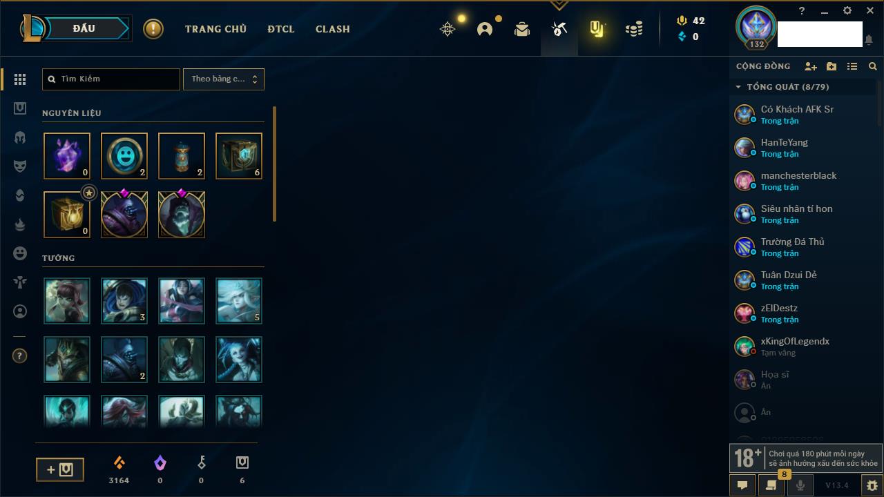Rank Đơn: Bạch Kim IIIKhung: Bạch kimTướng: 171 - Còn 251383 THXTrang Phục: 229Rank ĐTCL: Sắt IILinh Thú: 51