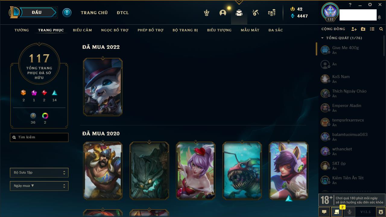 Rank Đơn: Vàng IIIKhung: VàngTướng: 171 - Còn 88128 THXTrang Phục: 329Rank ĐTCL: Chưa RankLinh Thú: 41