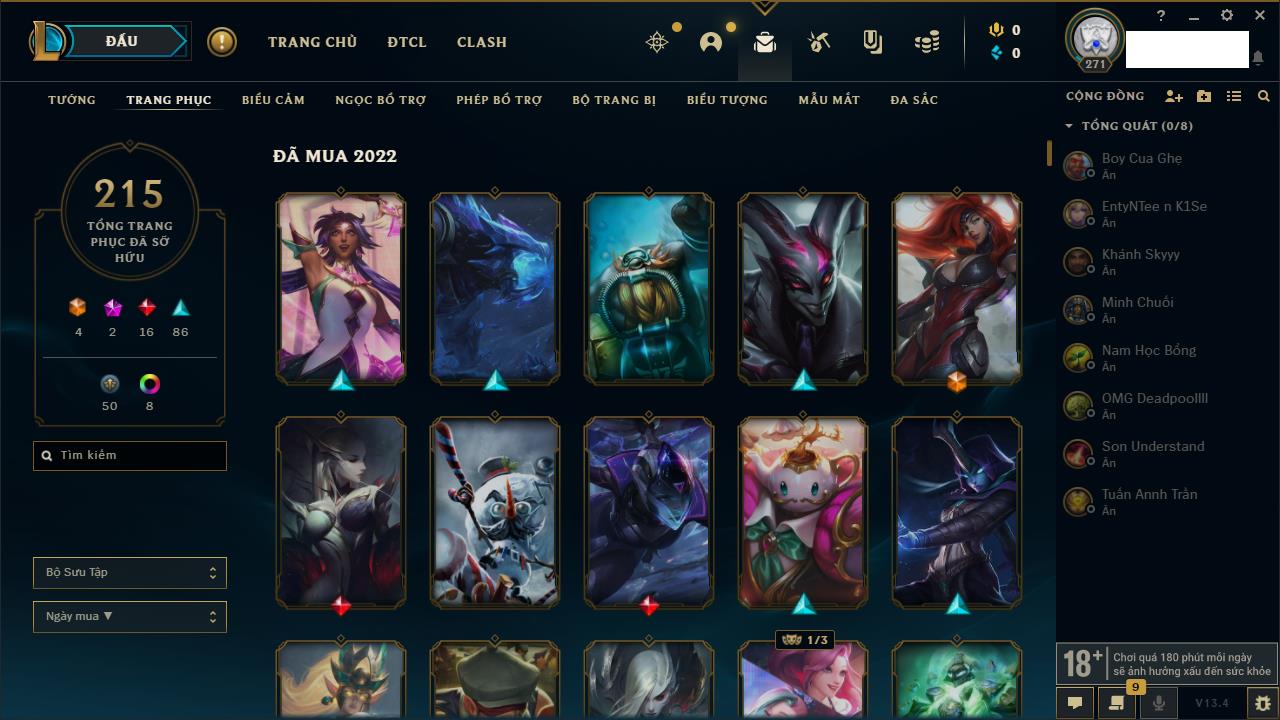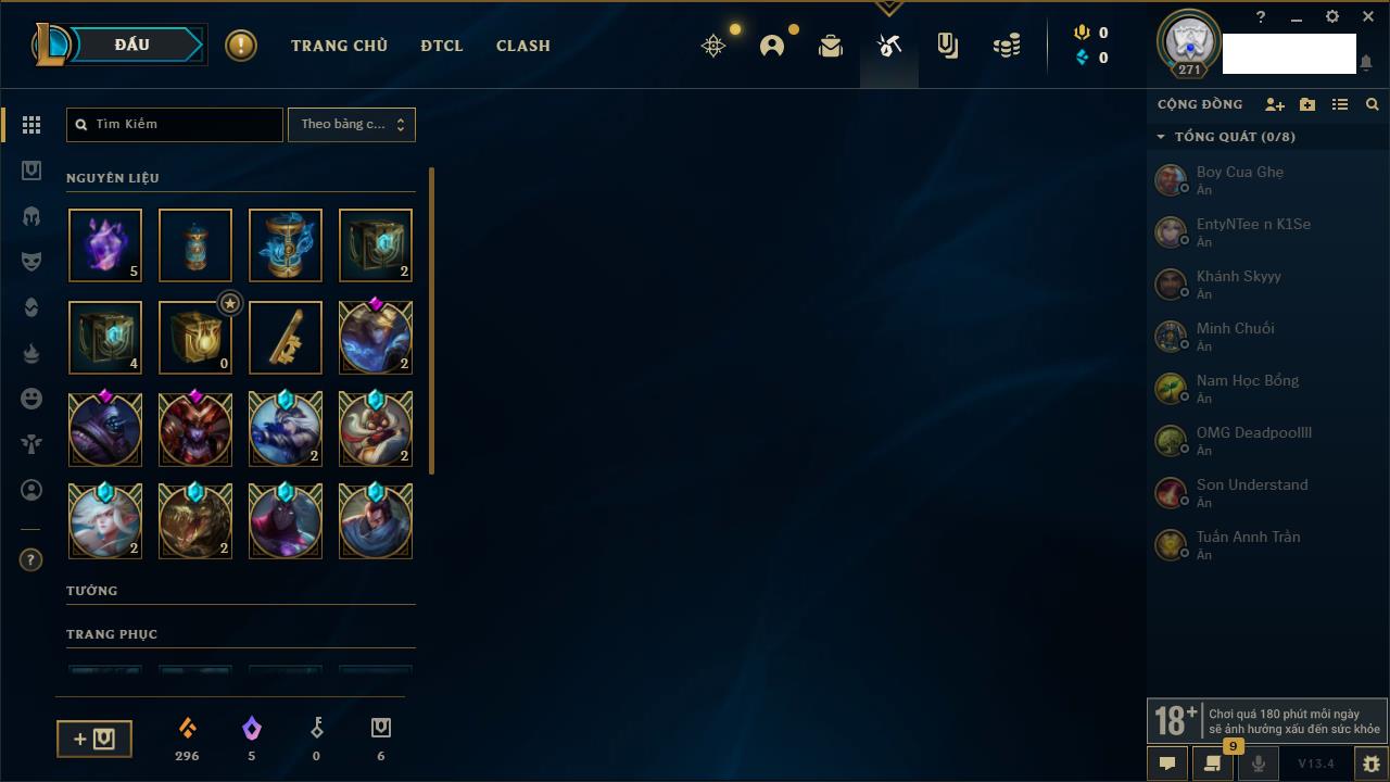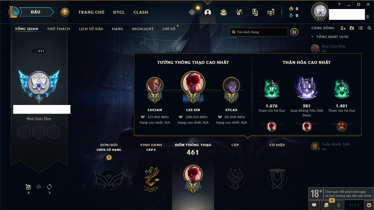 Rank Đơn: Vàng IVKhung: VàngTướng: 171 - Còn 48721 THXTrang Phục: 171Rank ĐTCL: Chưa RankLinh Thú: 27