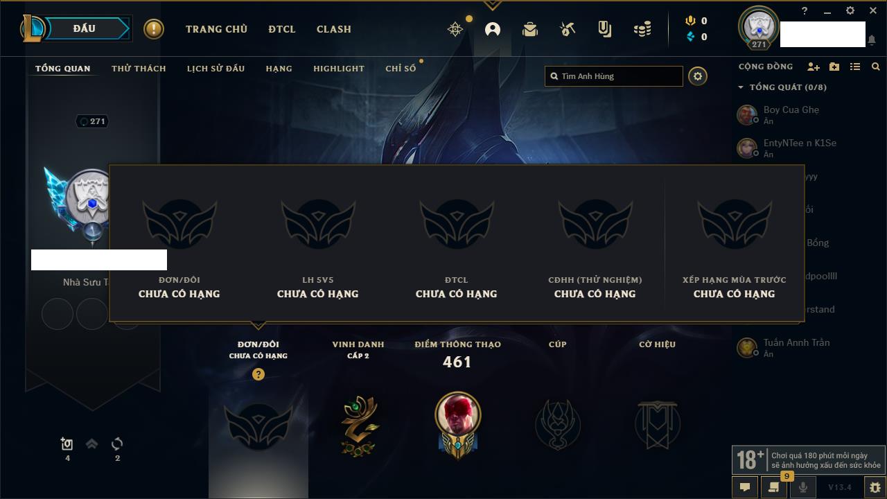 Rank Đơn: Vàng IVKhung: Chưa có khungTướng: 172 - Còn 55166 THXTrang Phục: 166Rank ĐTCL: Sắt IILinh Thú: 173