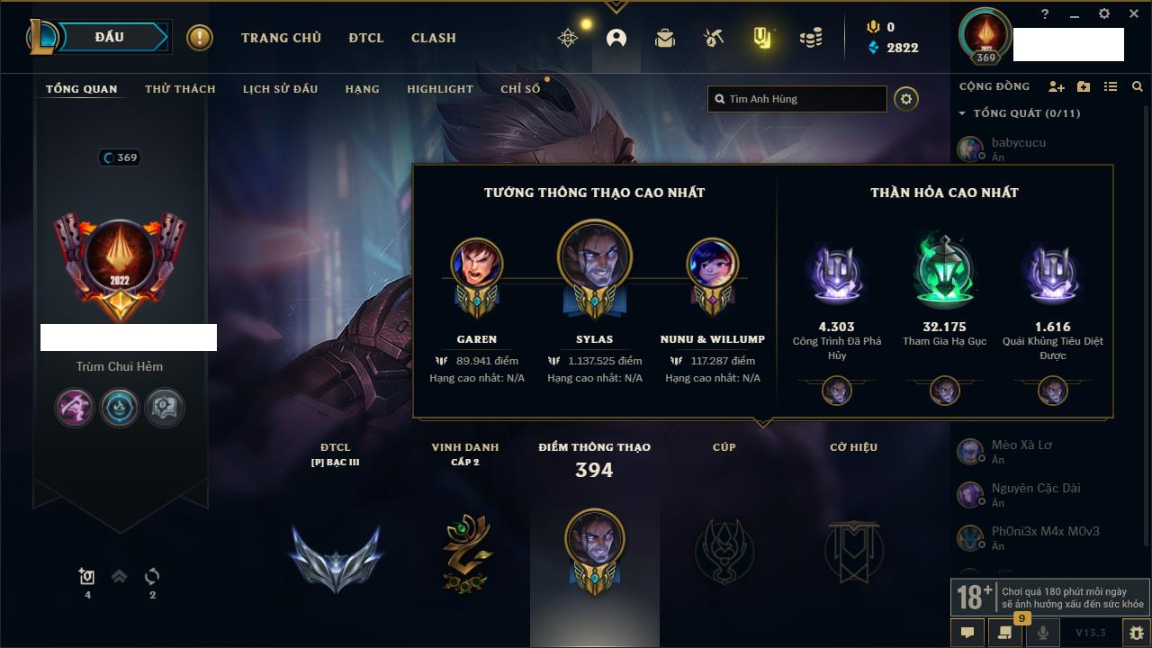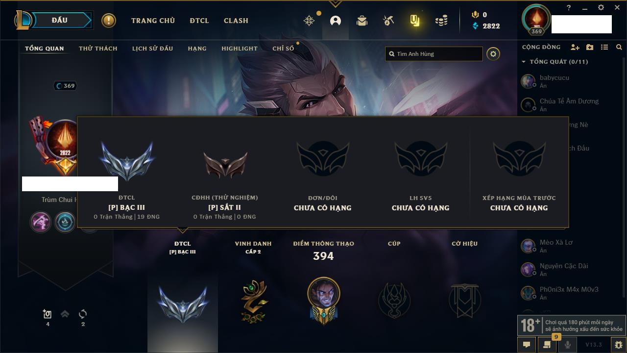 Rank Đơn: Bạch Kim IIKhung: Bạch kimTướng: 171 - Còn 316137 THXTrang Phục: 89Rank ĐTCL: Bạch Kim IIILinh Thú: 94