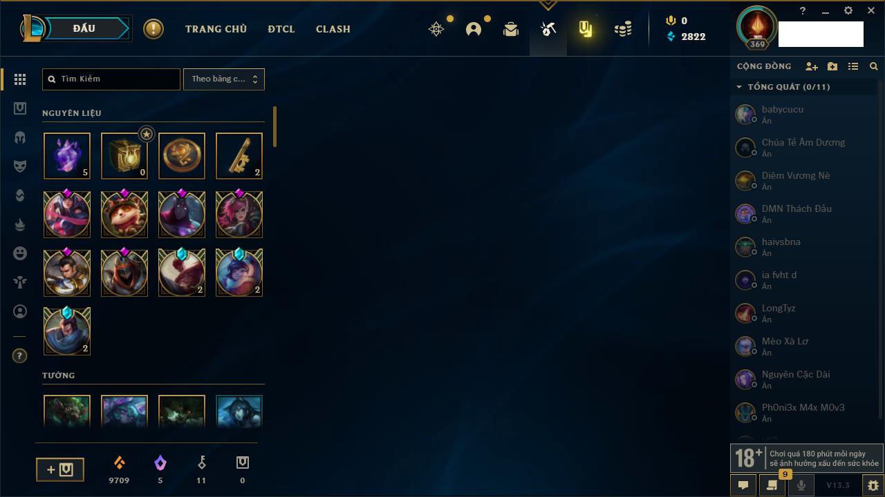 Rank Đơn: Vàng IIIKhung: VàngTướng: 172 - Còn 164704 THXTrang Phục: 255Rank ĐTCL: Kim Cương IVLinh Thú: 156