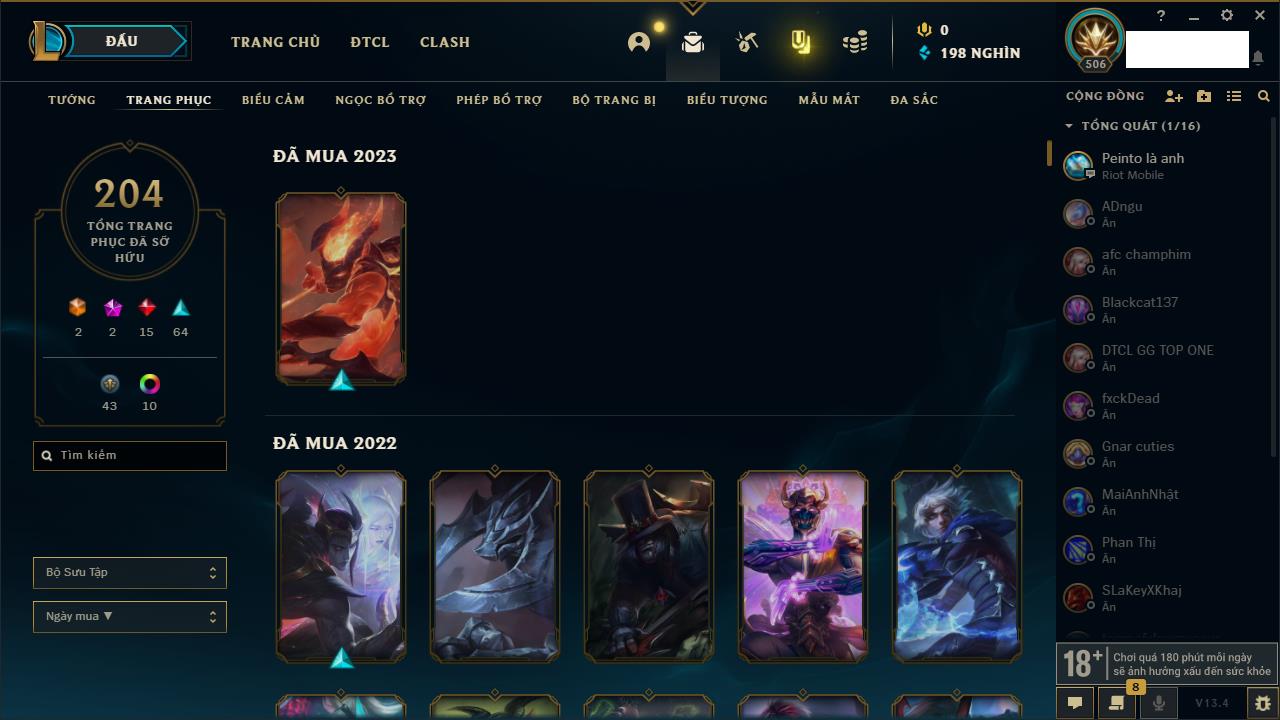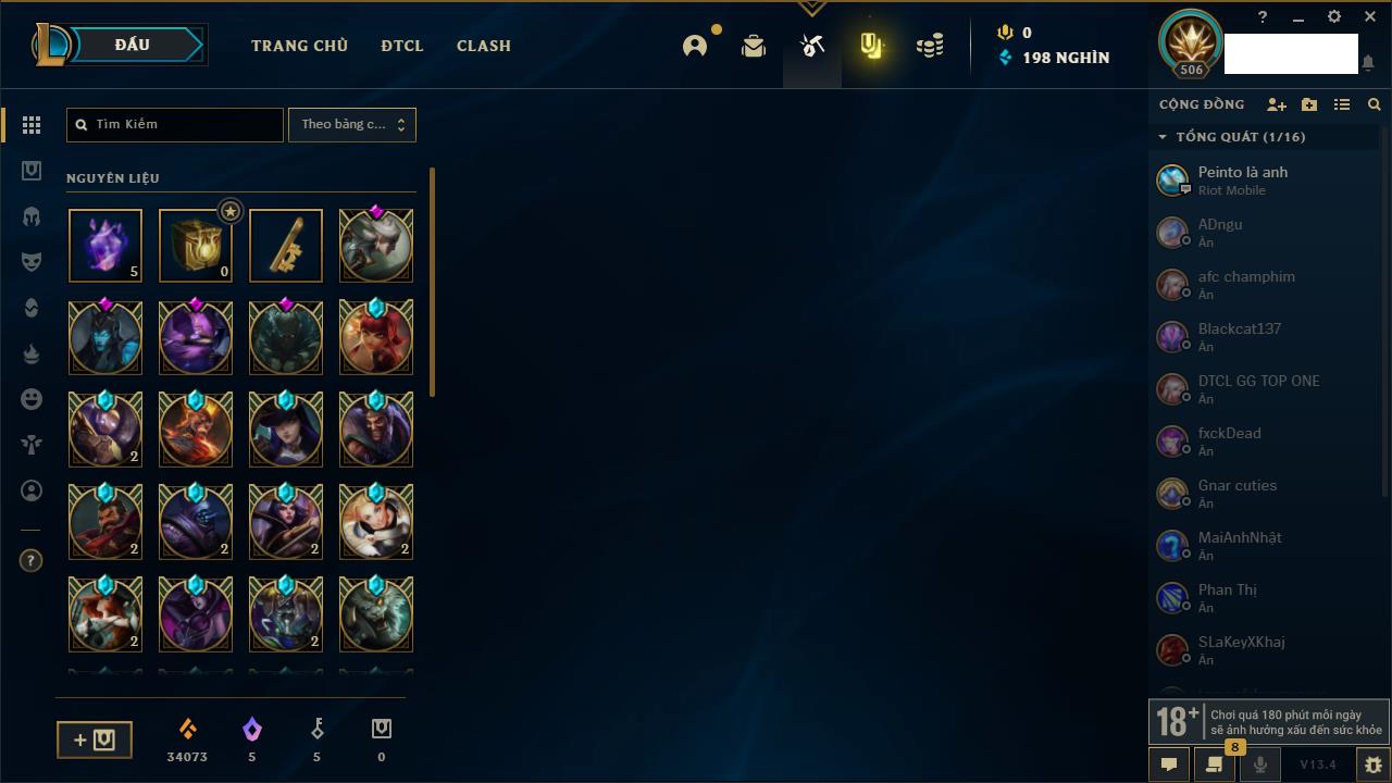 Rank Đơn: Vàng IVKhung: VàngTướng: 171 - Còn 48721 THXTrang Phục: 171Rank ĐTCL: Chưa RankLinh Thú: 27