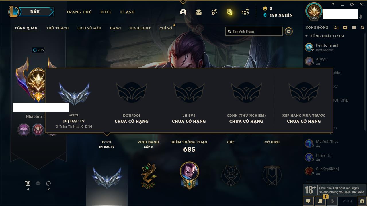 Rank Đơn: Bạc IIKhung: VàngTướng: 171 - Còn 332462 THXTrang Phục: 165Rank ĐTCL: Kim Cương IVLinh Thú: 181