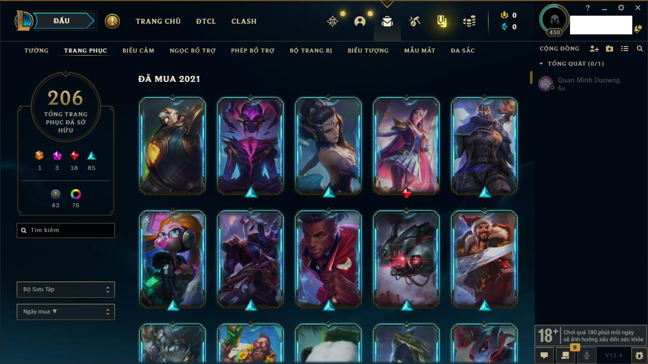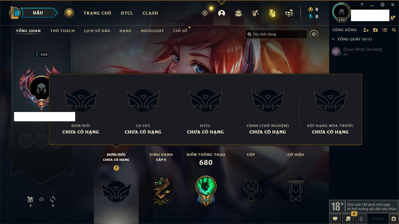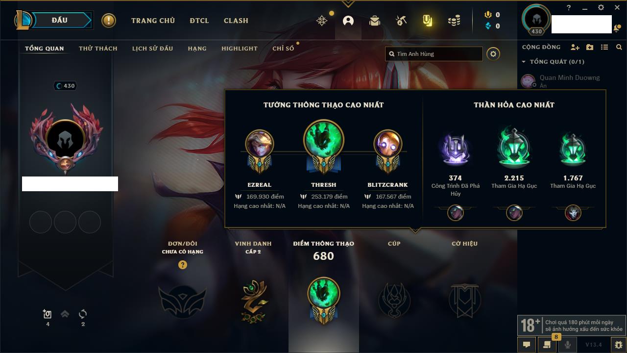 Rank Đơn: Bạc IIIKhung: BạcTướng: 171 - Còn 51045 THXTrang Phục: 220Rank ĐTCL: Sắt IILinh Thú: 141