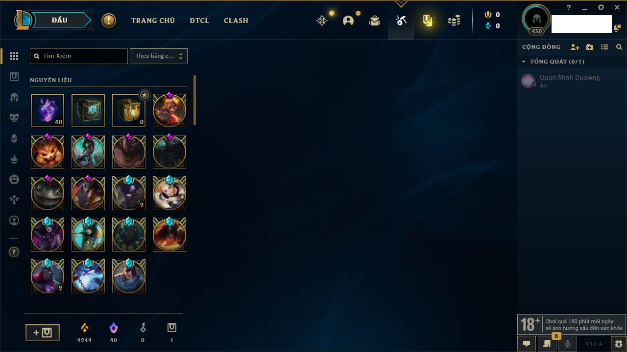 Rank Đơn: Vàng IVKhung: VàngTướng: 170 - Còn 84355 THXTrang Phục: 199Rank ĐTCL: Chưa RankLinh Thú: 116