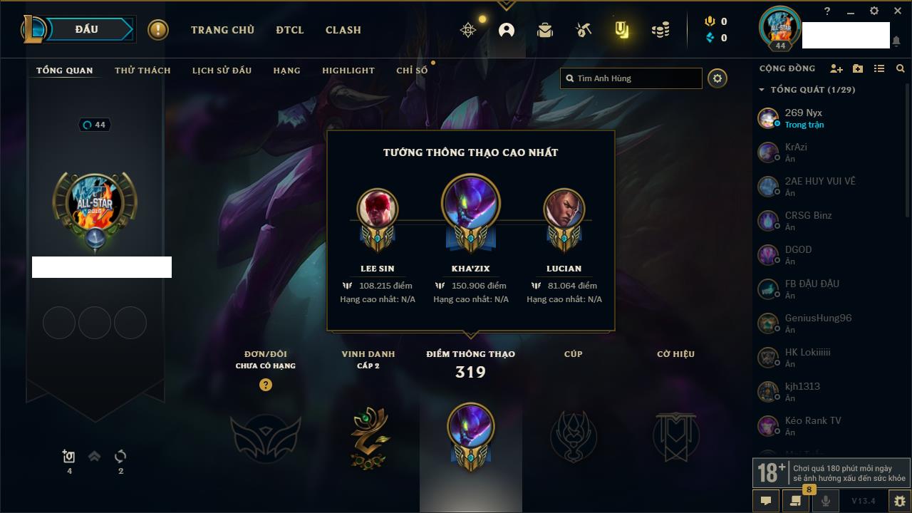 Rank Đơn: Bạch Kim IIIKhung: Bạch kimTướng: 171 - Còn 251383 THXTrang Phục: 229Rank ĐTCL: Sắt IILinh Thú: 51
