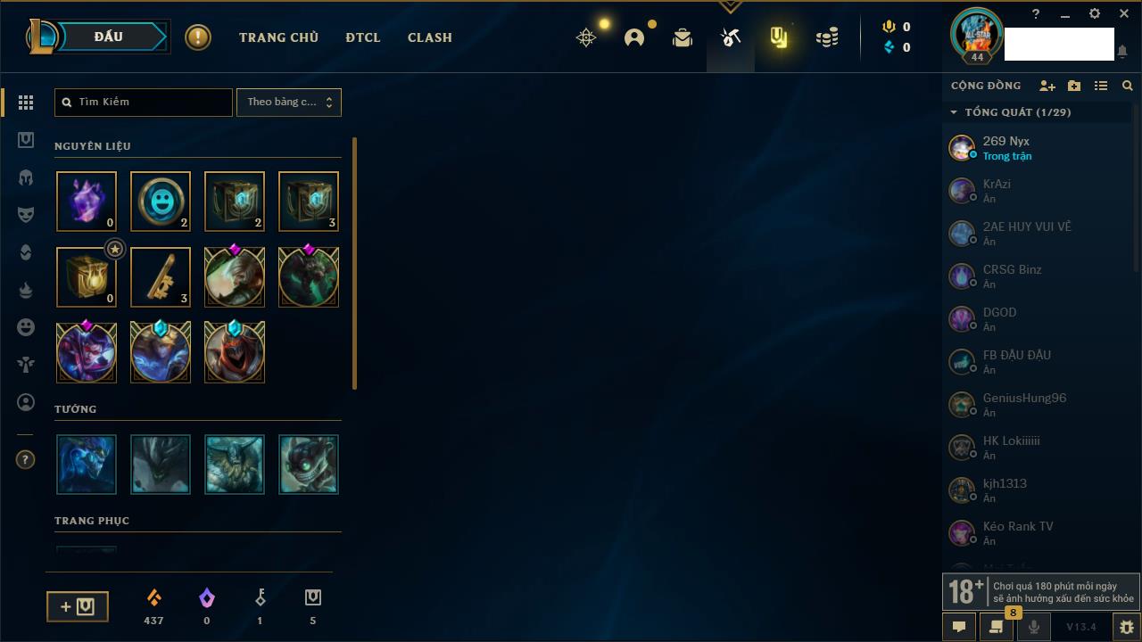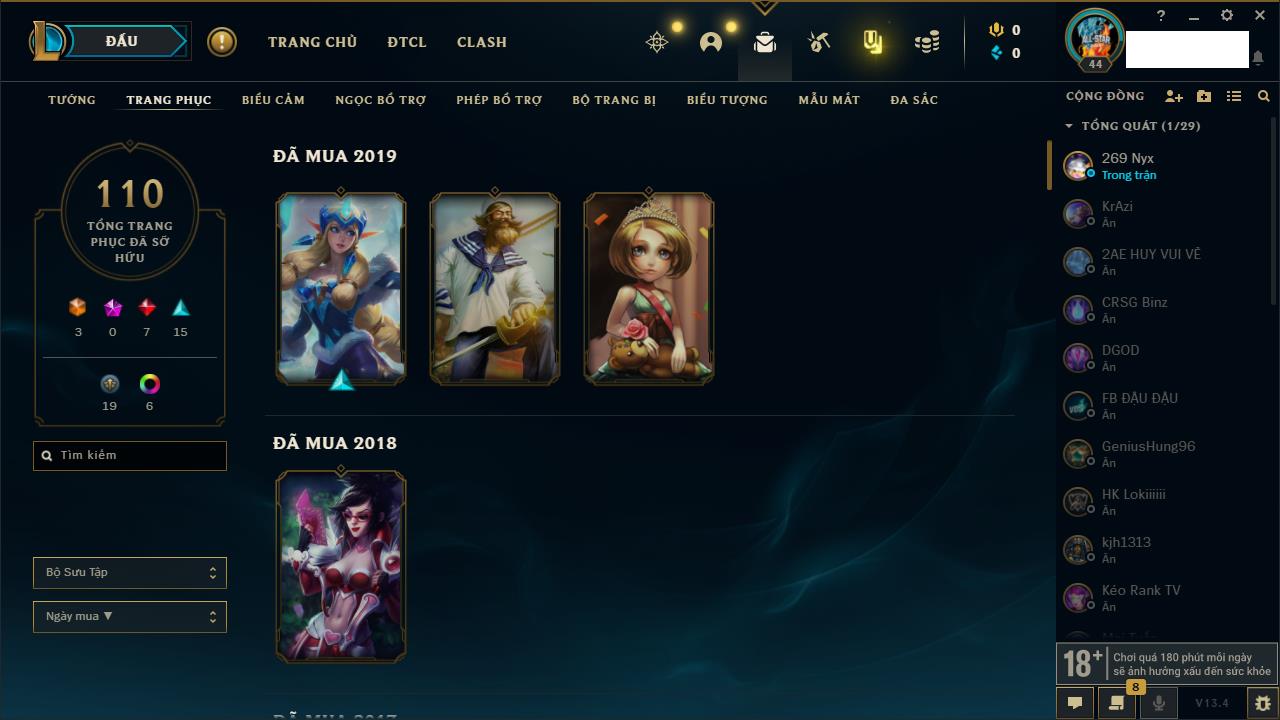 Rank Đơn: Vàng IIIKhung: VàngTướng: 171 - Còn 88128 THXTrang Phục: 329Rank ĐTCL: Chưa RankLinh Thú: 41
