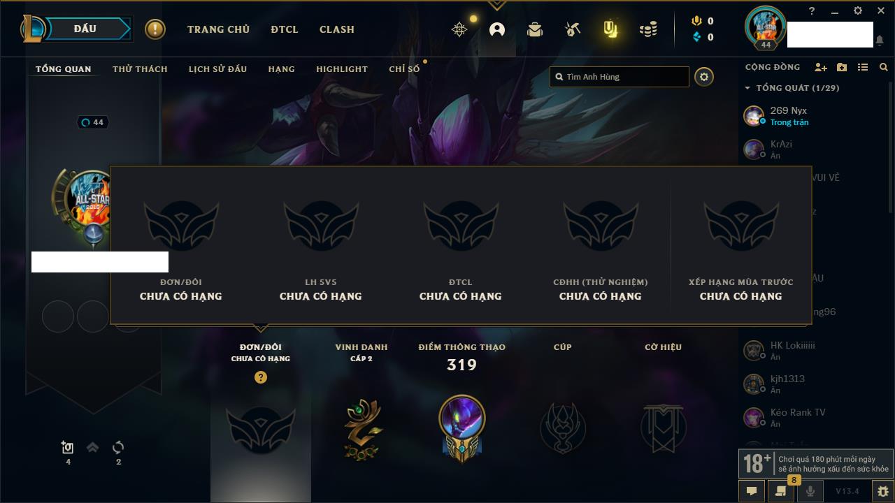 Rank Đơn: Vàng IKhung: BạcTướng: 171 - Còn 60584 THXTrang Phục: 286Rank ĐTCL: Vàng IIILinh Thú: 117