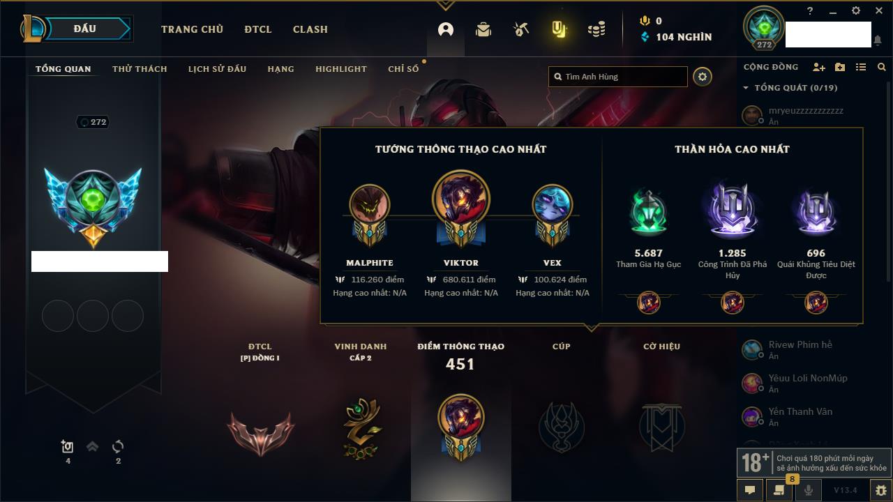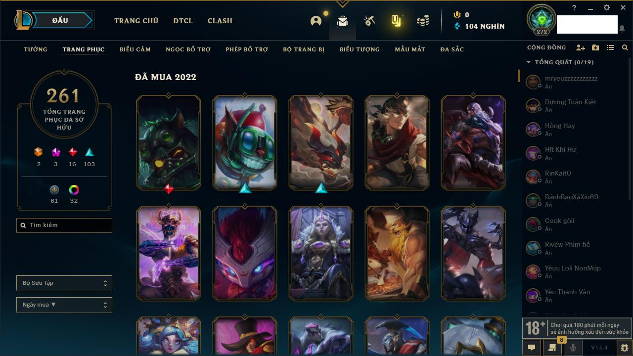 Rank Đơn: Vàng IKhung: Bạch kimTướng: 170 - Còn 212450 THXTrang Phục: 214Rank ĐTCL: Bạch Kim IVLinh Thú: 221