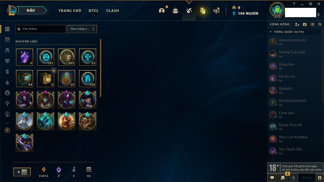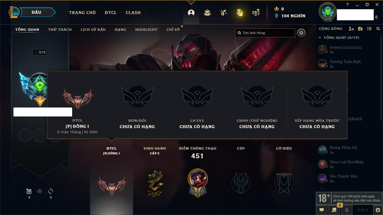 Rank Đơn: Bạch Kim IIIKhung: Bạch kimTướng: 170 - Còn 61079 THXTrang Phục: 352Rank ĐTCL: Sắt IILinh Thú: 70
