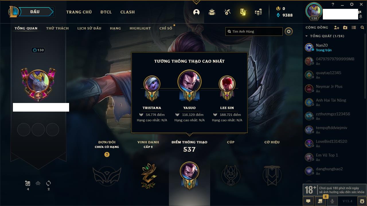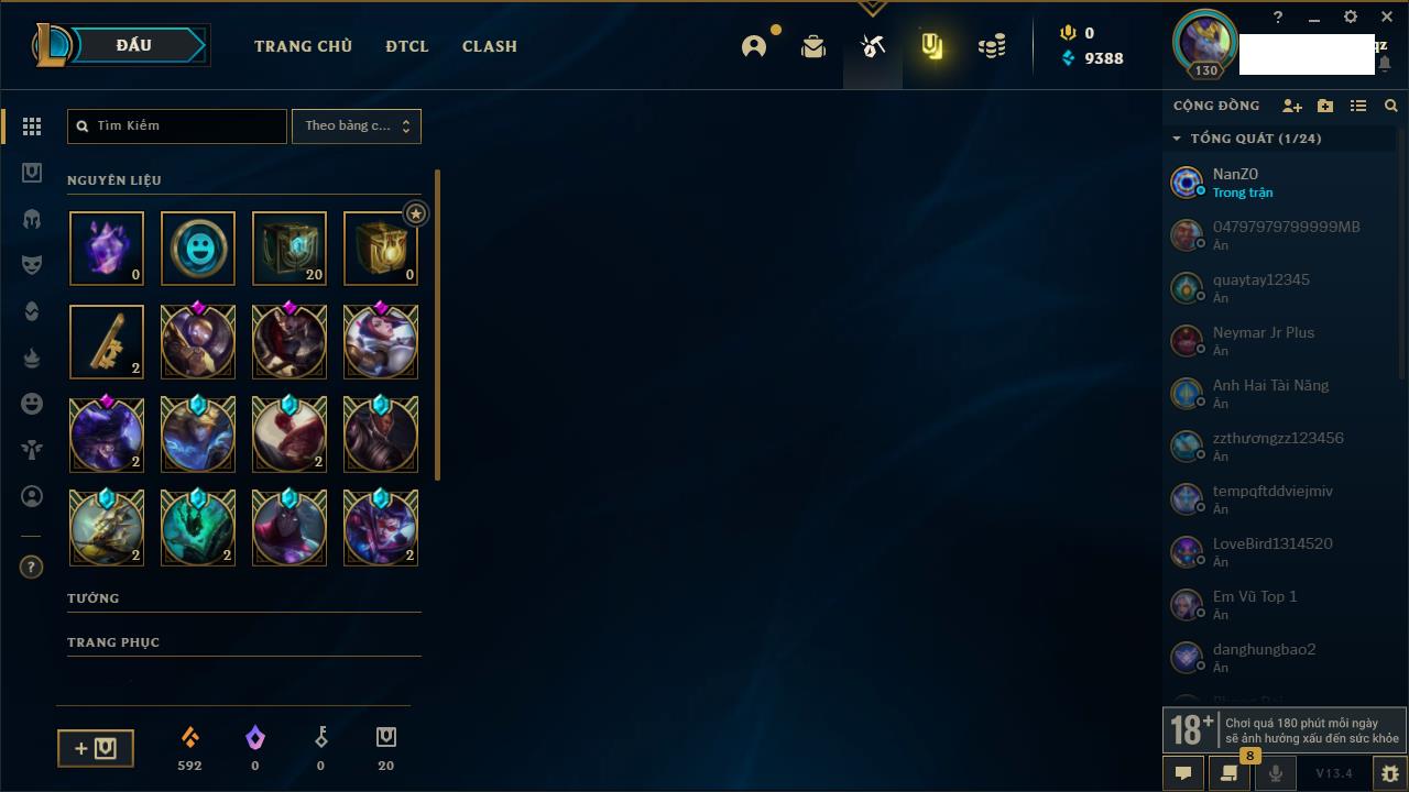 Rank Đơn: Chưa RankKhung: Chưa có khungTướng: 162 - Còn 23234 THXTrang Phục: 150Rank ĐTCL: Chưa RankLinh Thú: 42