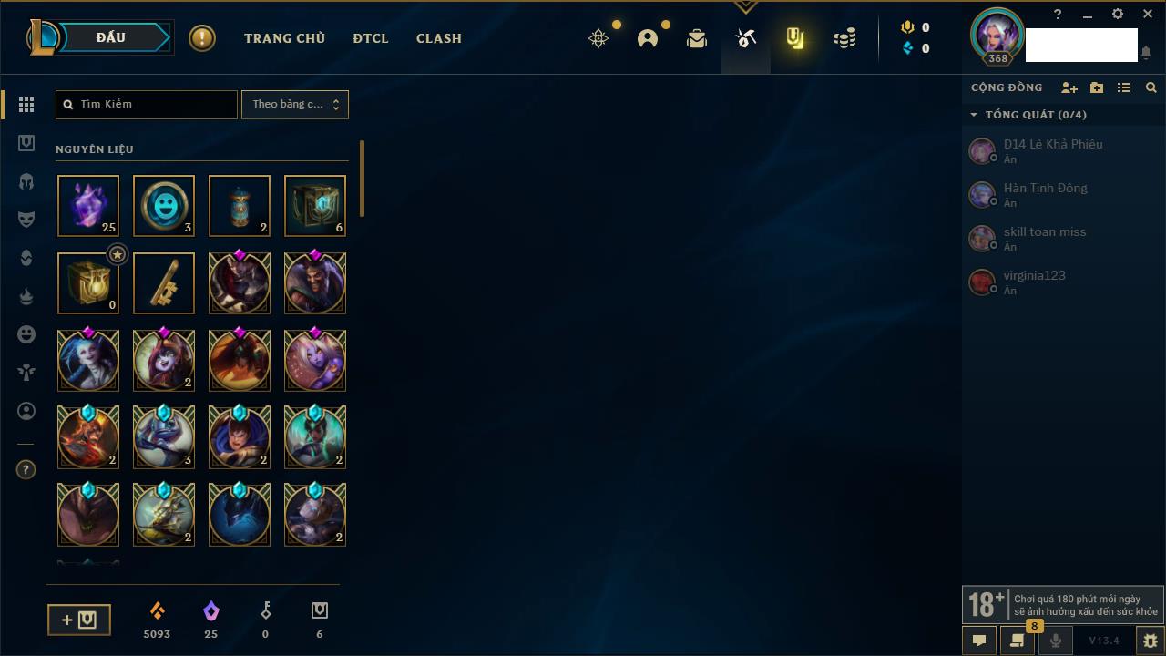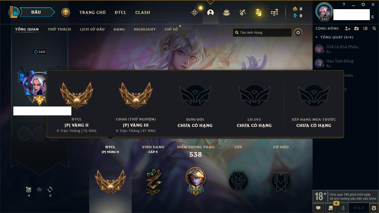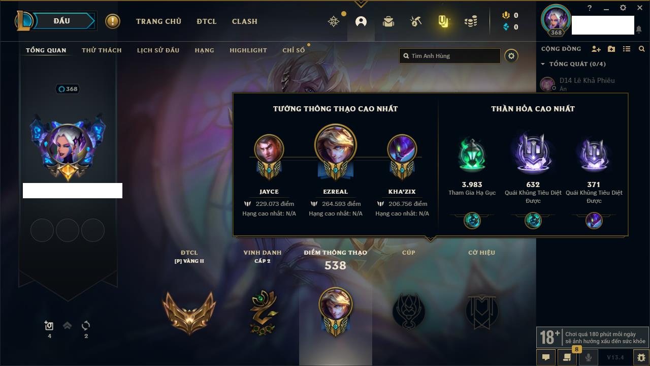 Rank Đơn: Bạc IVKhung: VàngTướng: 172 - Còn 358384 THXTrang Phục: 177Rank ĐTCL: Lục Bảo IILinh Thú: 211