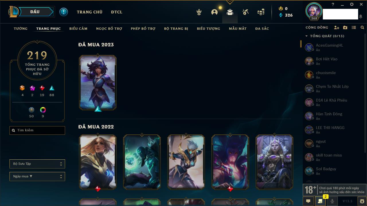 Rank Đơn: Vàng IVKhung: VàngTướng: 171 - Còn 48721 THXTrang Phục: 171Rank ĐTCL: Chưa RankLinh Thú: 27