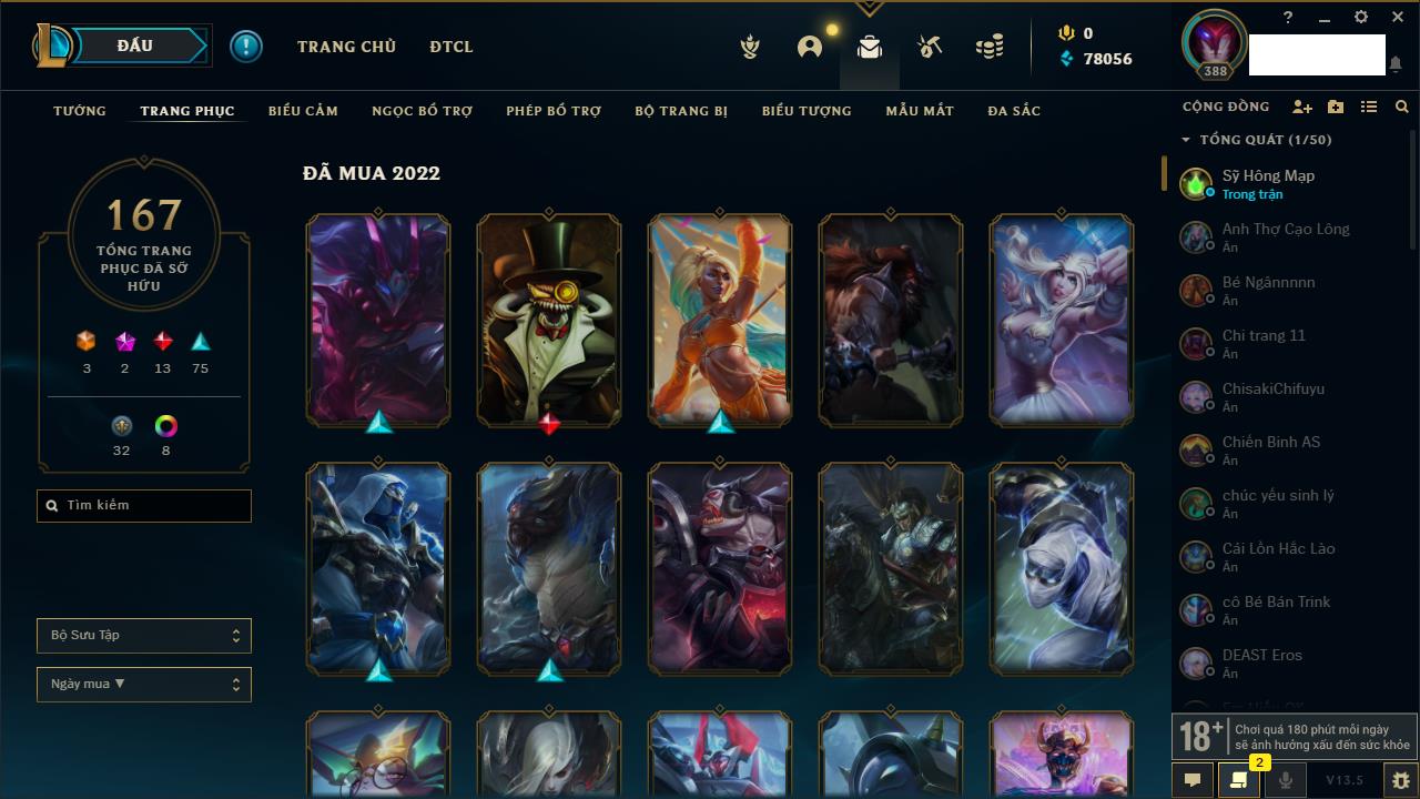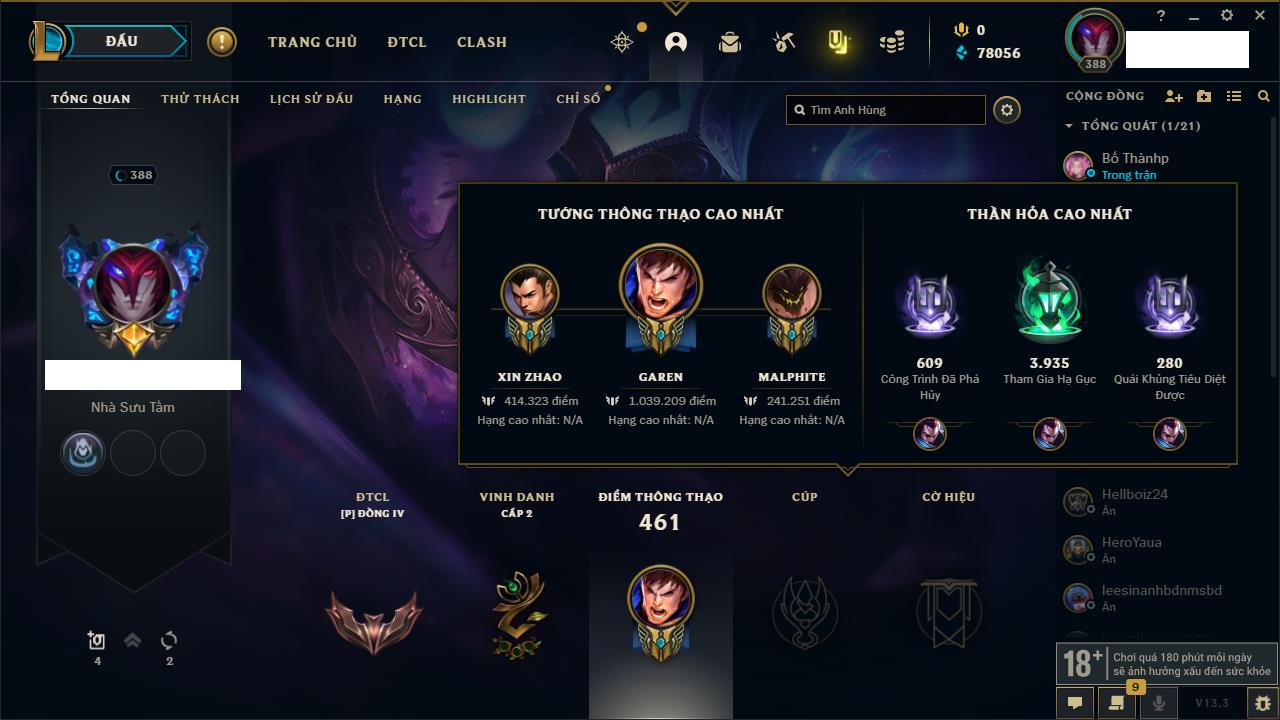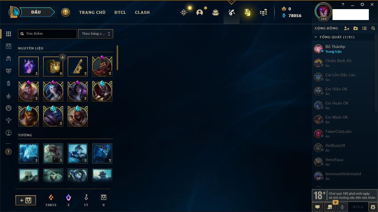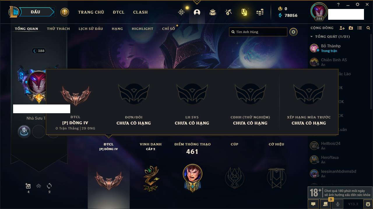 Rank Đơn: Vàng IIIKhung: BạcTướng: 171 - Còn 101359 THXTrang Phục: 88Rank ĐTCL: Kim Cương IVLinh Thú: 200