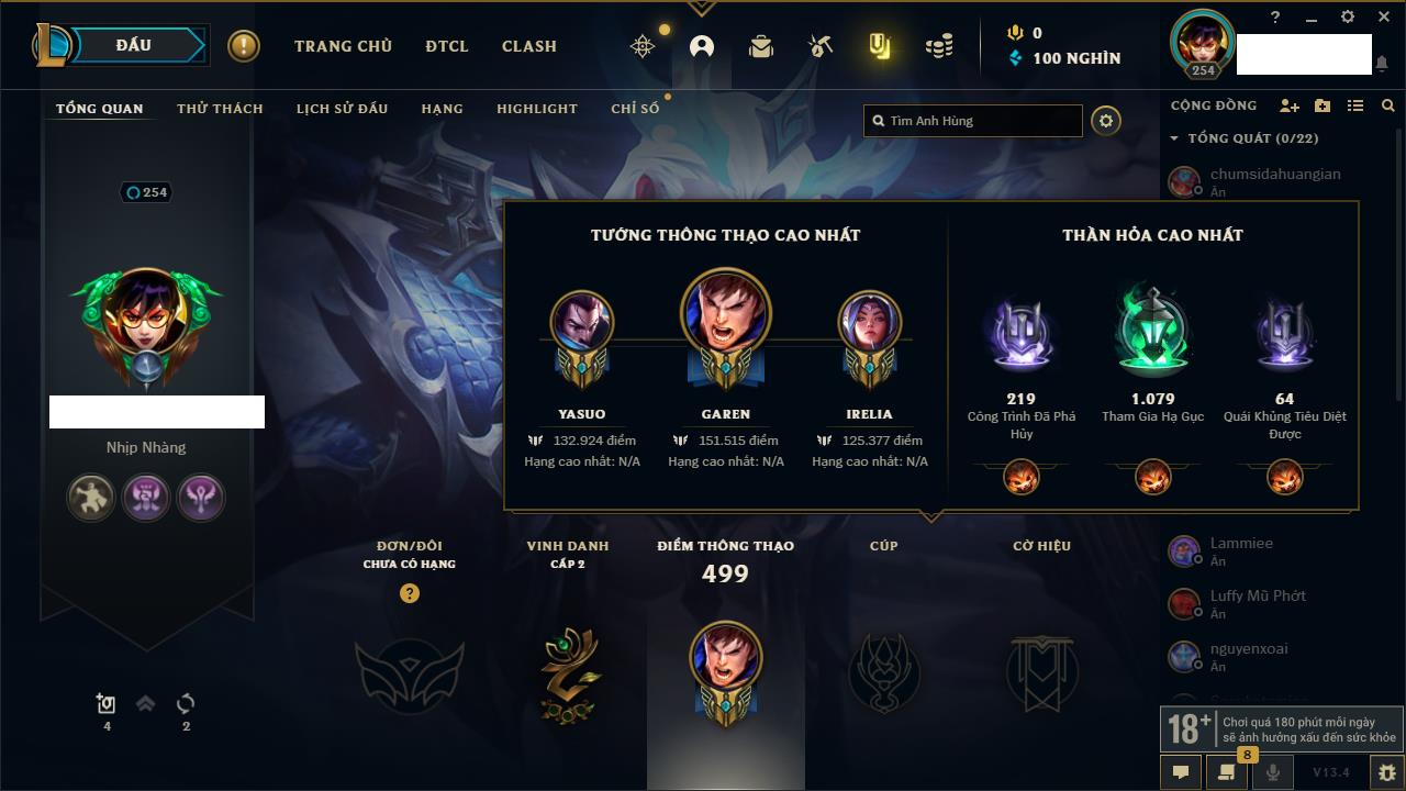 Rank Đơn: Đồng IKhung: ĐồngTướng: 168 - Còn 11447 THXTrang Phục: 245Rank ĐTCL: Chưa RankLinh Thú: 53