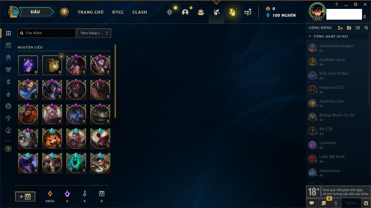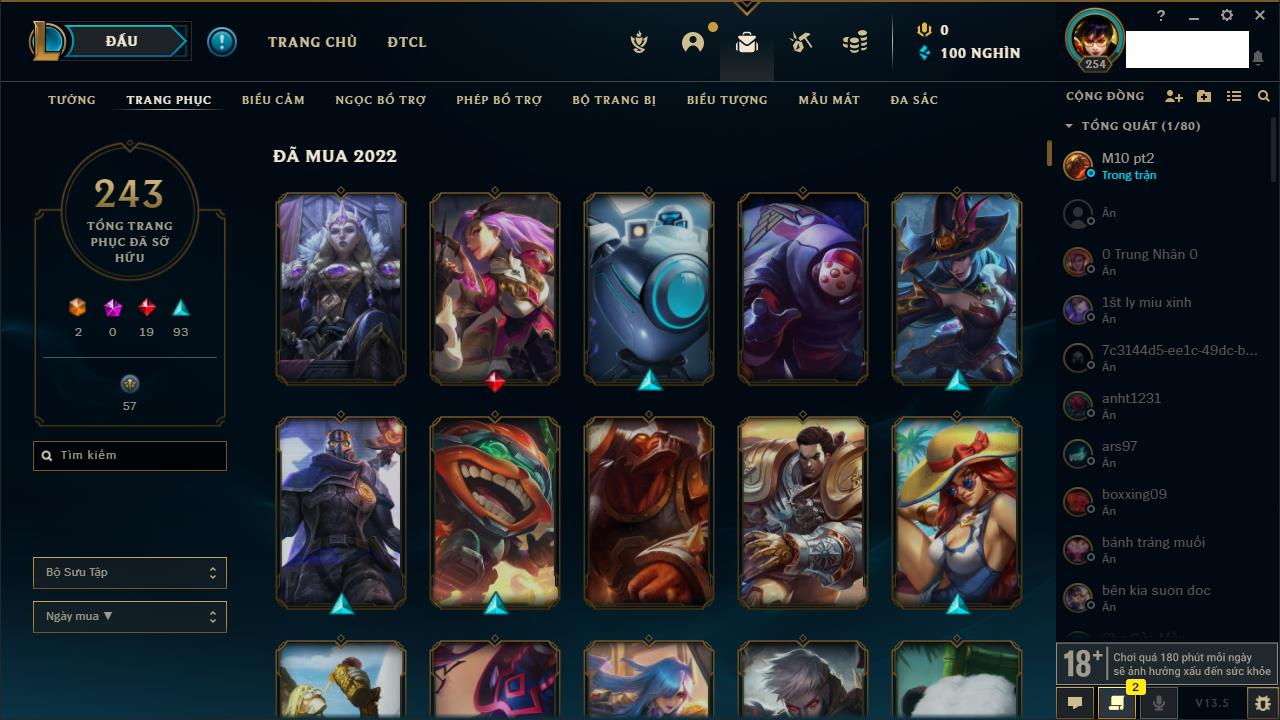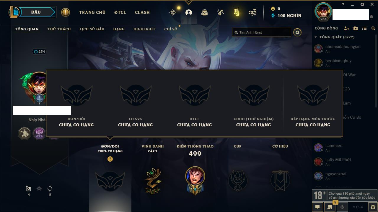 Rank Đơn: Vàng IIIKhung: BạcTướng: 171 - Còn 101359 THXTrang Phục: 88Rank ĐTCL: Kim Cương IVLinh Thú: 200