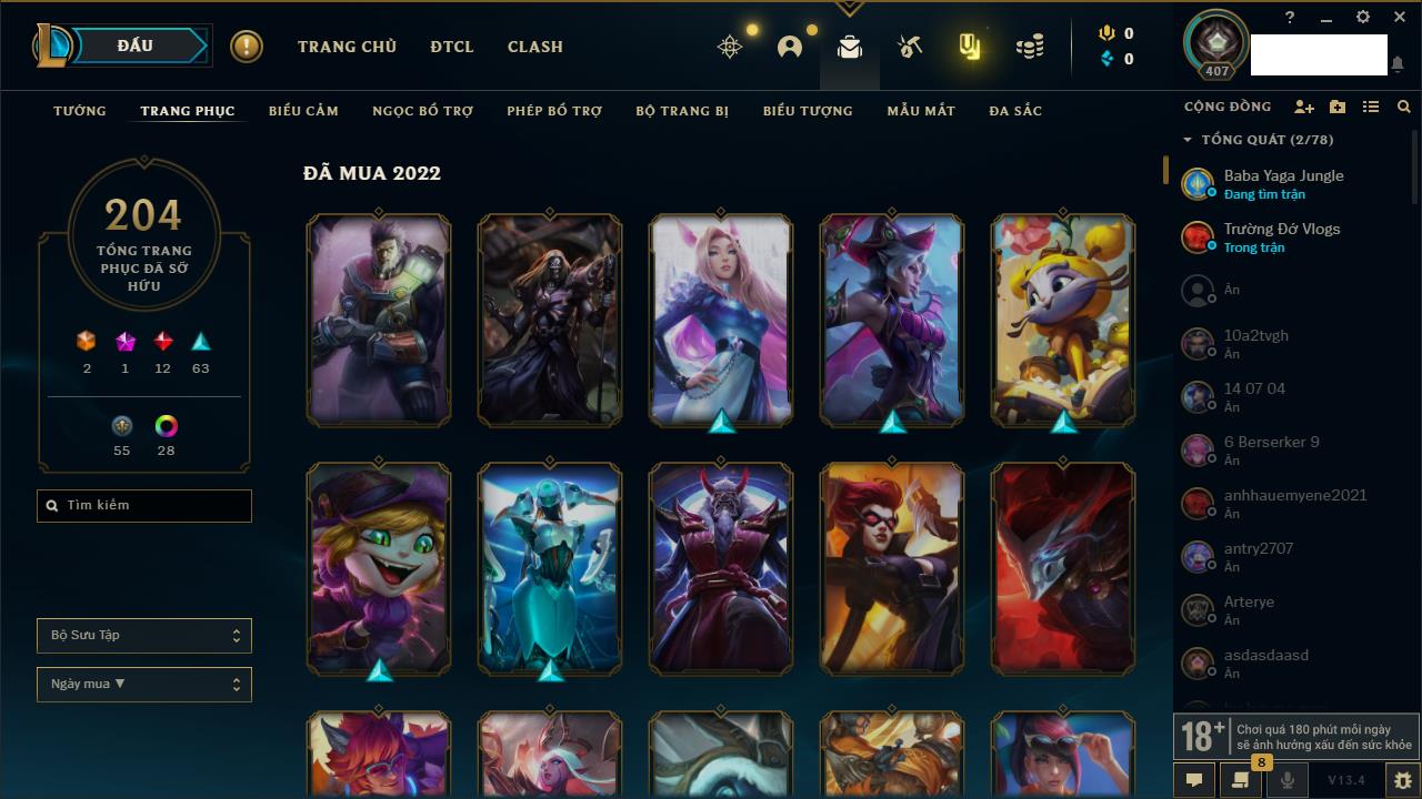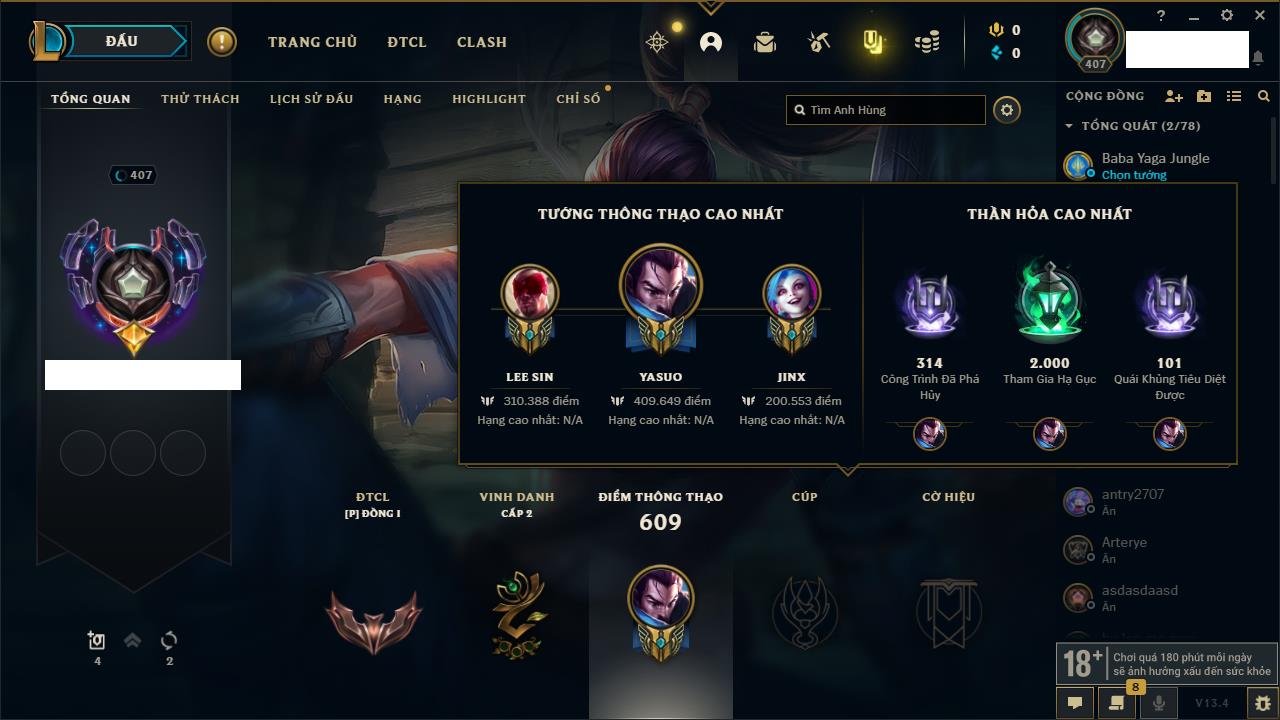 Rank Đơn: Vàng IVKhung: VàngTướng: 171 - Còn 48721 THXTrang Phục: 171Rank ĐTCL: Chưa RankLinh Thú: 27
