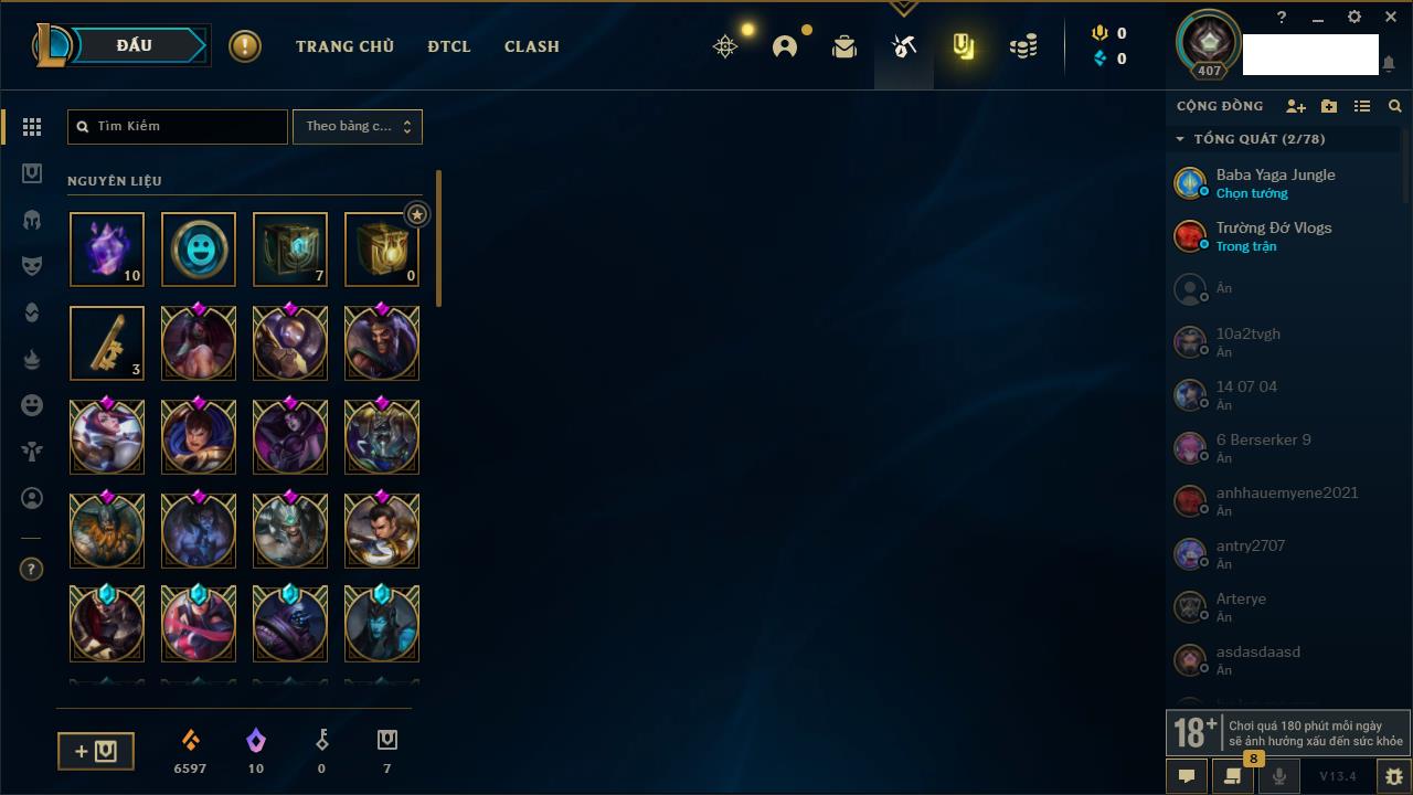Rank Đơn: Vàng IVKhung: BạcTướng: 171 - Còn 231097 THXTrang Phục: 180Rank ĐTCL: Vàng IVLinh Thú: 110