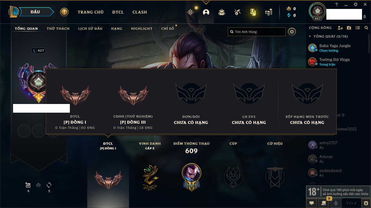 Rank Đơn: Bạc IIKhung: VàngTướng: 171 - Còn 332462 THXTrang Phục: 165Rank ĐTCL: Kim Cương IVLinh Thú: 181