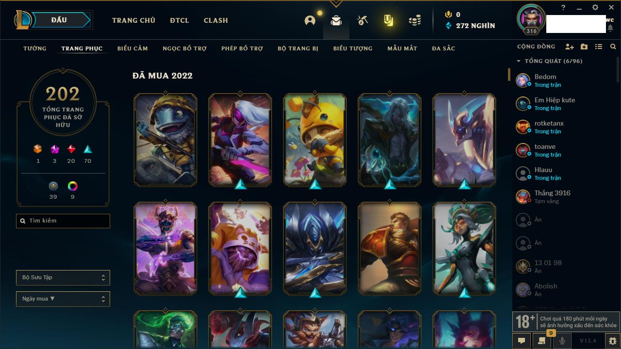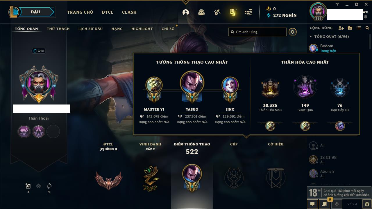Rank Đơn: Bạch Kim IIKhung: Bạch kimTướng: 171 - Còn 316137 THXTrang Phục: 89Rank ĐTCL: Bạch Kim IIILinh Thú: 94