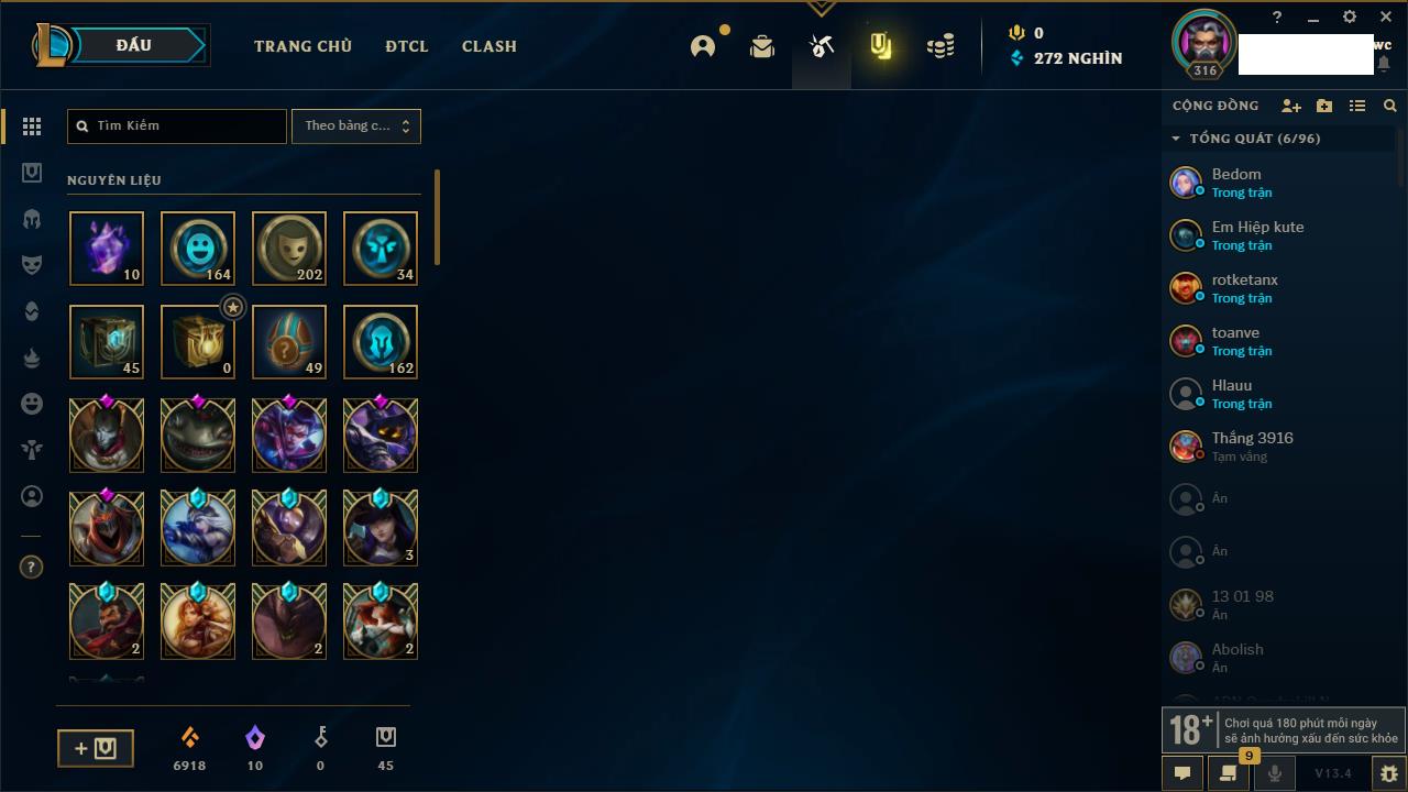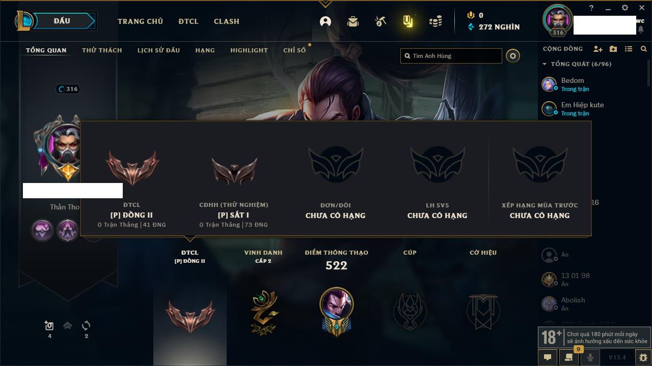Rank Đơn: Bạch Kim IIKhung: Bạch kimTướng: 171 - Còn 315217 THXTrang Phục: 238Rank ĐTCL: Bạch Kim ILinh Thú: 116