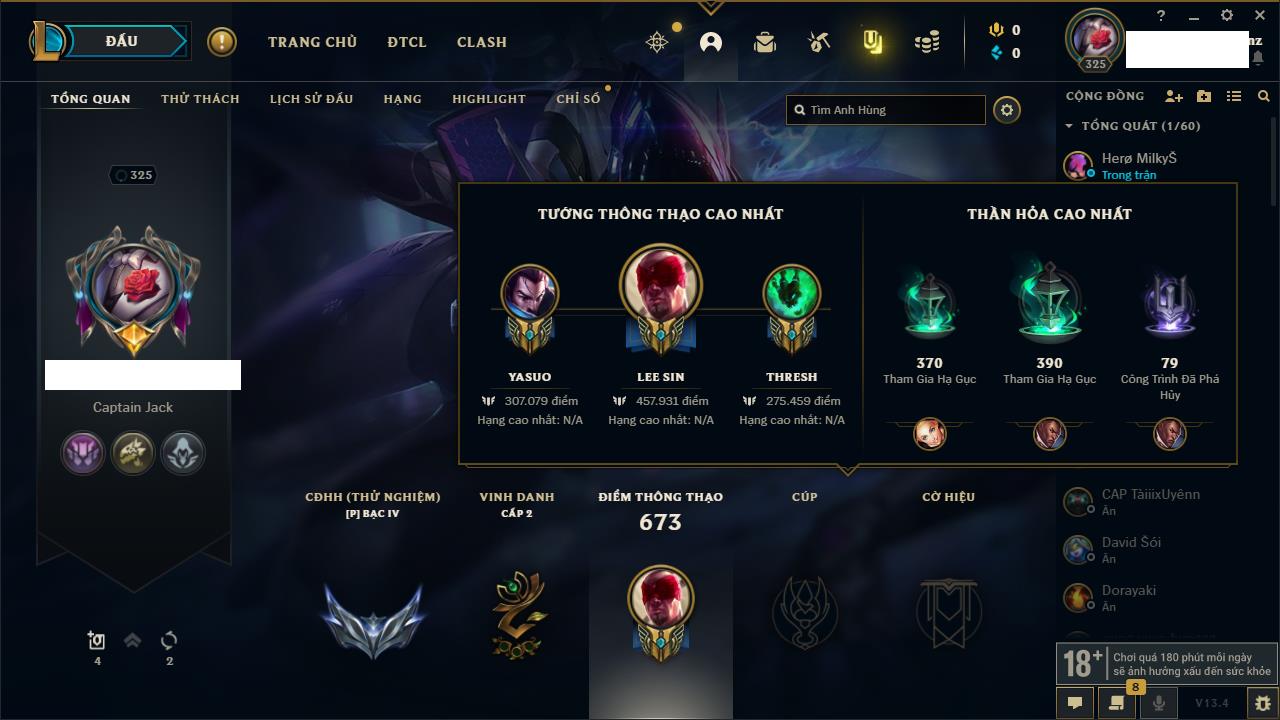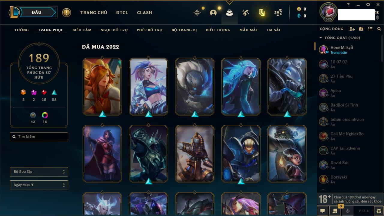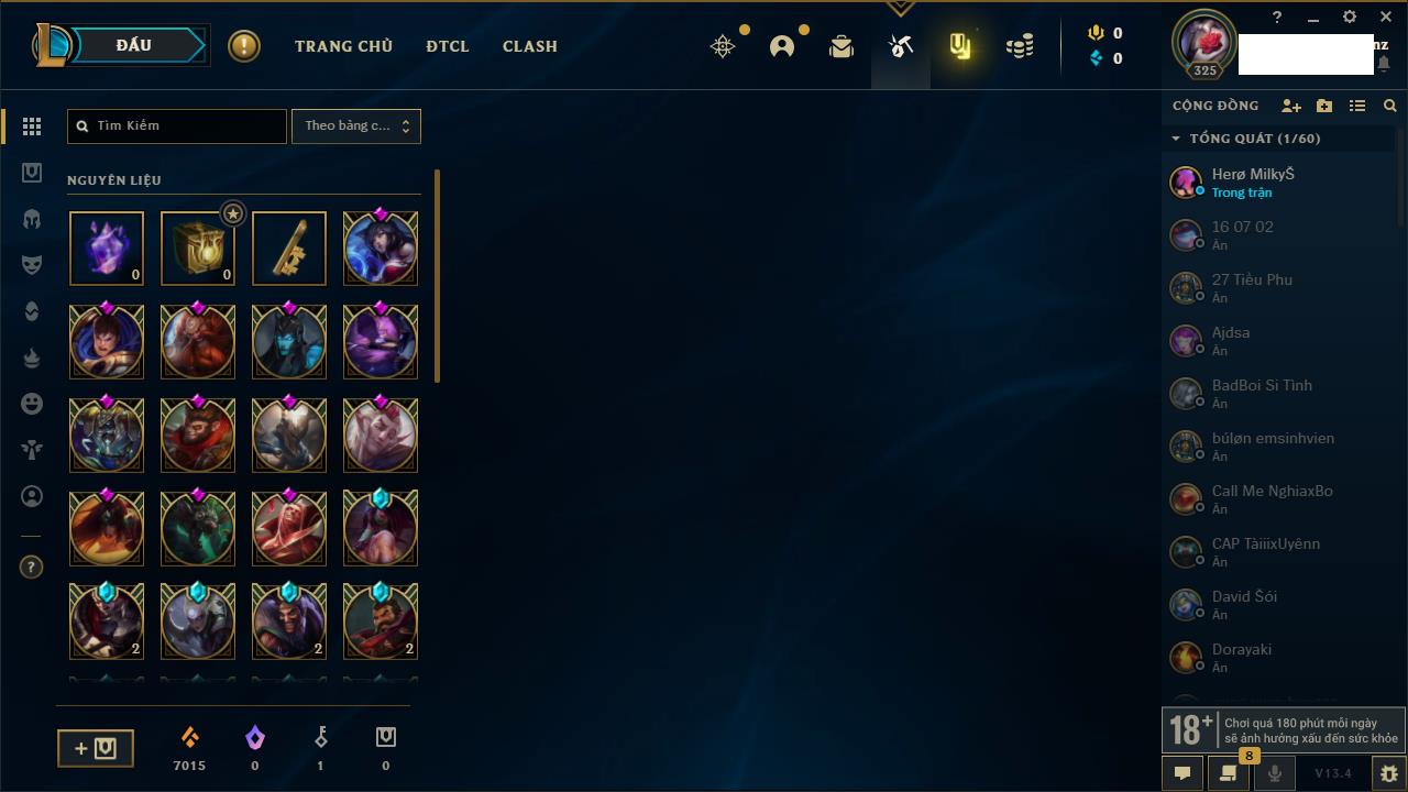 Rank Đơn: Đồng IIKhung: Chưa có khungTướng: 170 - Còn 56487 THXTrang Phục: 90Rank ĐTCL: Chưa RankLinh Thú: 129