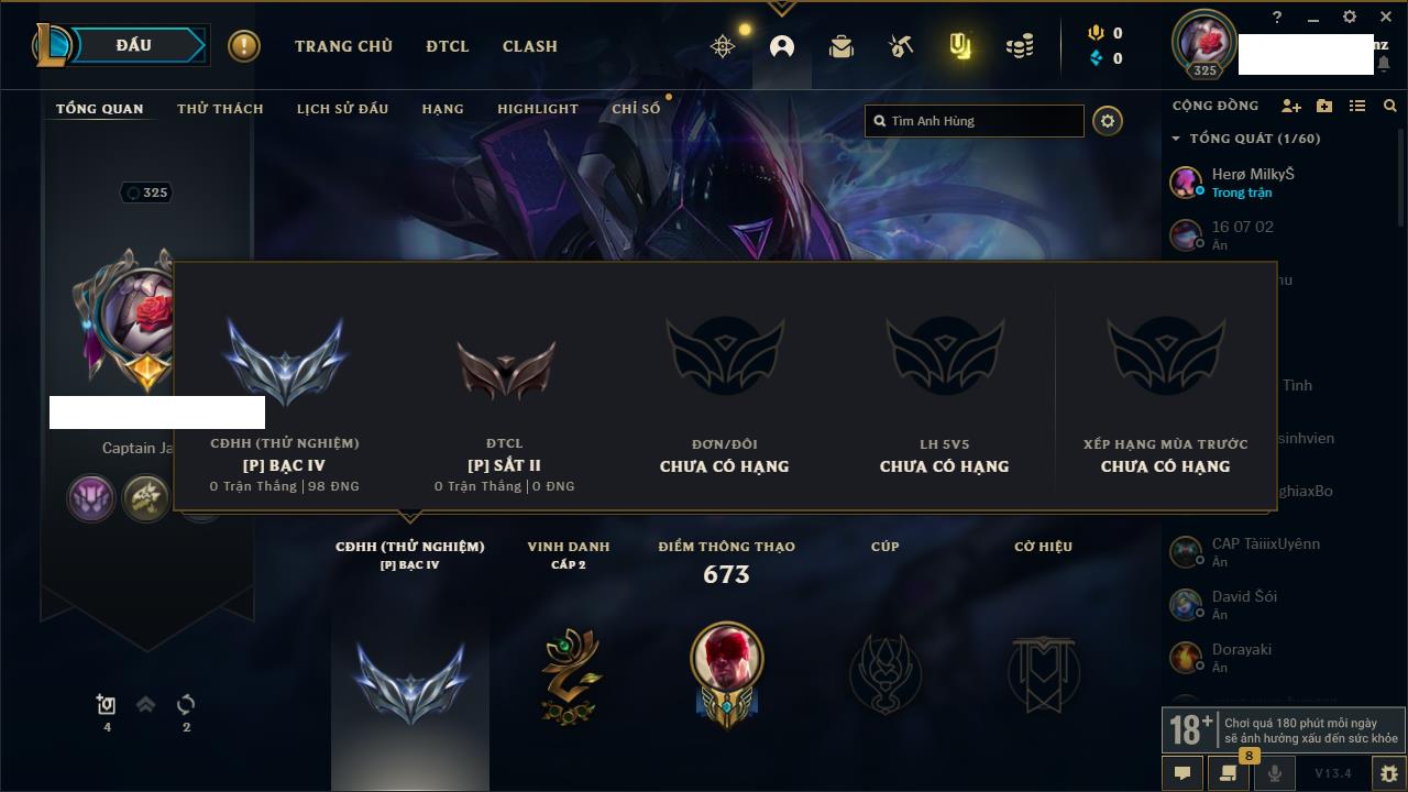 Rank Đơn: Đồng IIIKhung: ĐồngTướng: 171 - Còn 54778 THXTrang Phục: 96Rank ĐTCL: Bạch Kim IIILinh Thú: 140