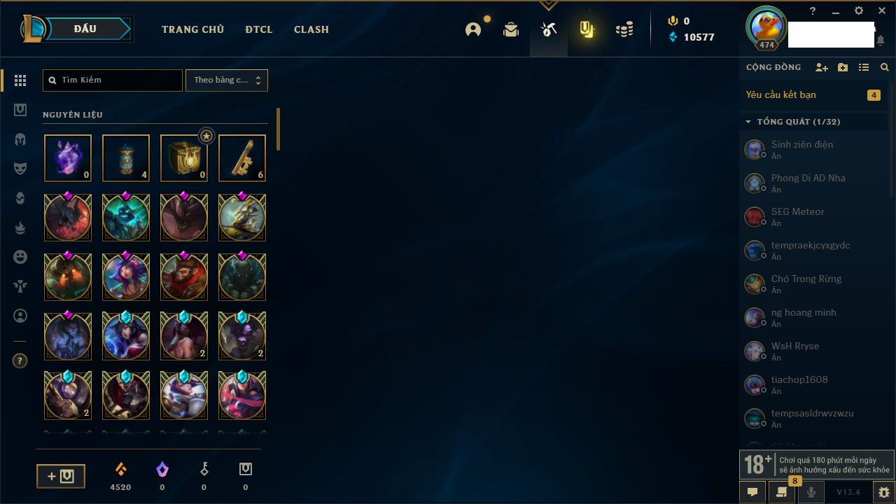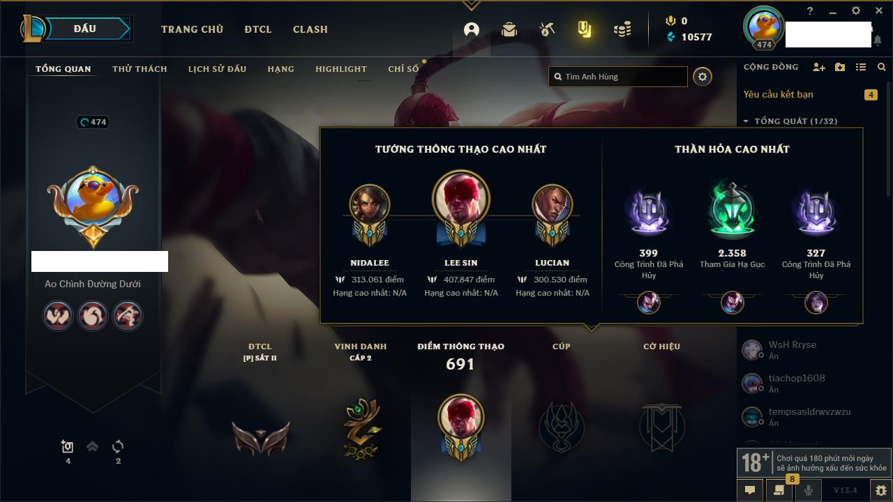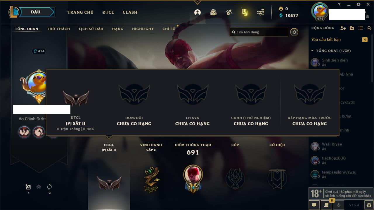Rank Đơn: Bạch Kim IVKhung: Bạch kimTướng: 171 - Còn 182788 THXTrang Phục: 158Rank ĐTCL: Lục Bảo IVLinh Thú: 56