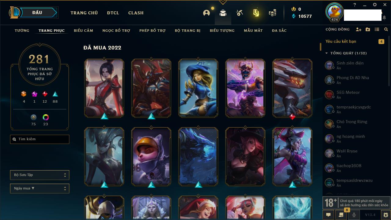 Rank Đơn: Vàng IKhung: Bạch kimTướng: 170 - Còn 212450 THXTrang Phục: 214Rank ĐTCL: Bạch Kim IVLinh Thú: 221